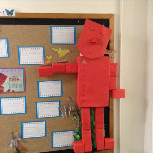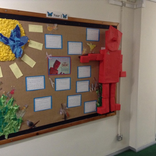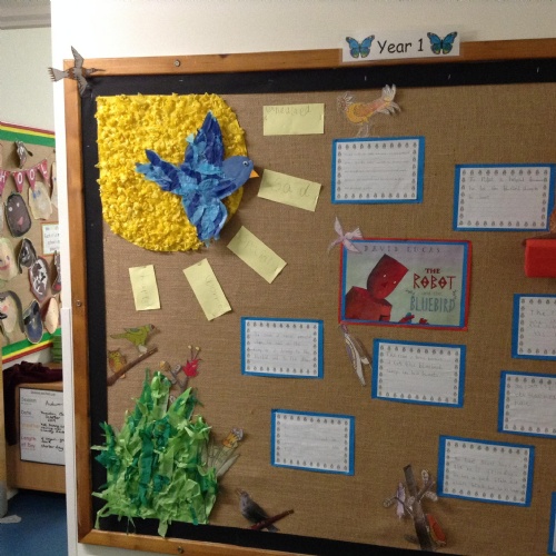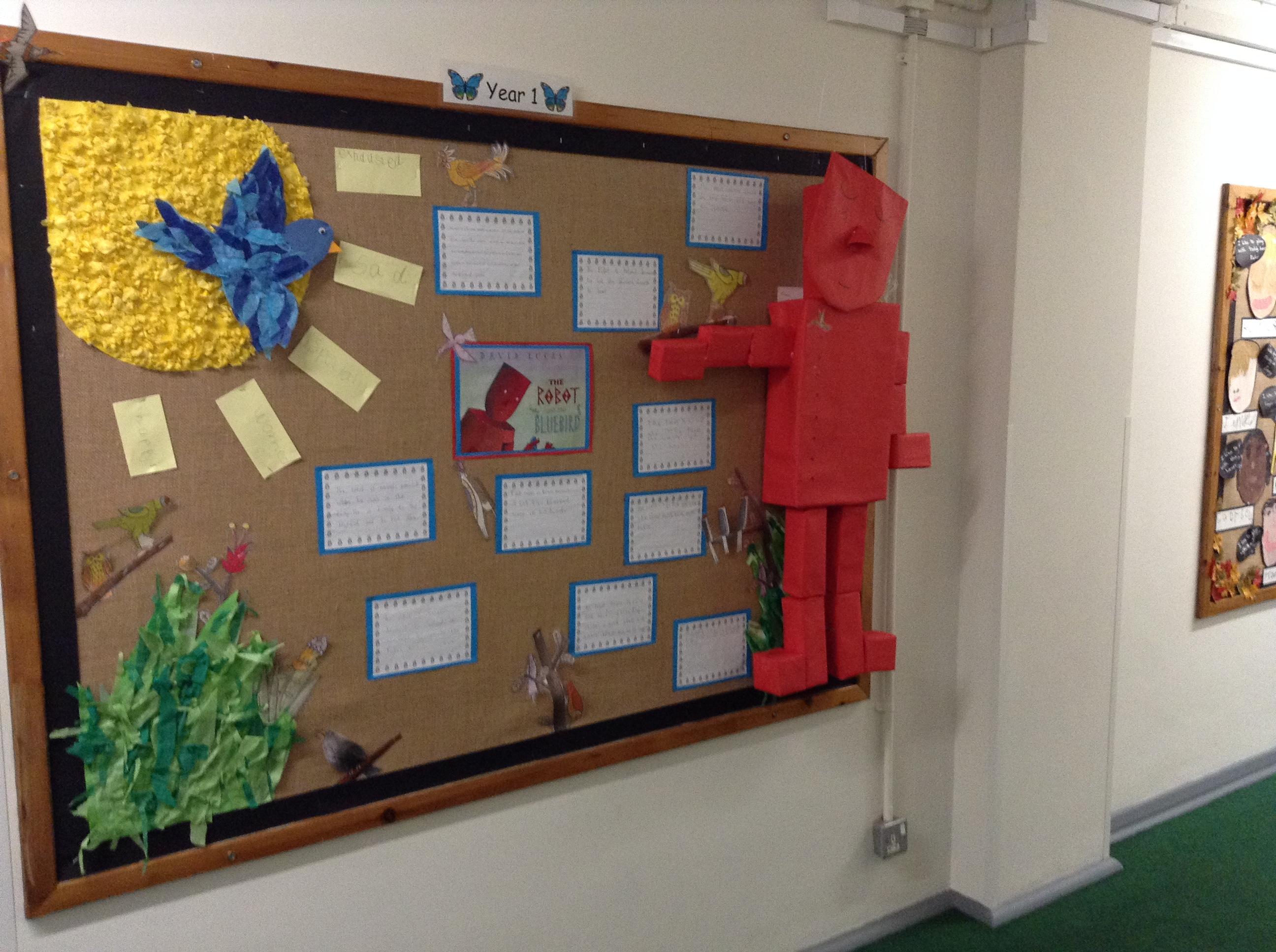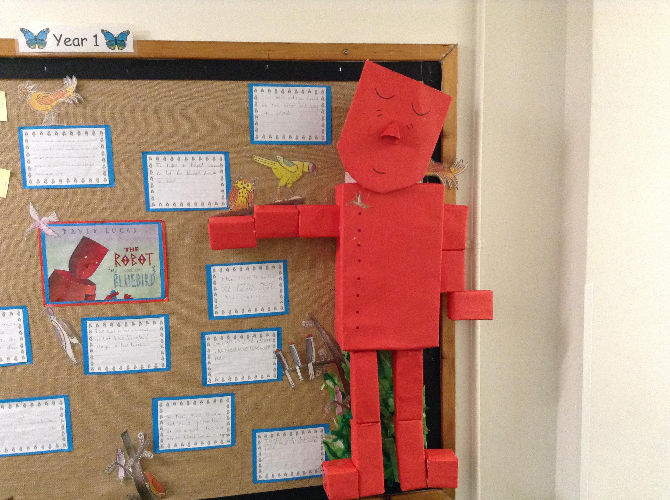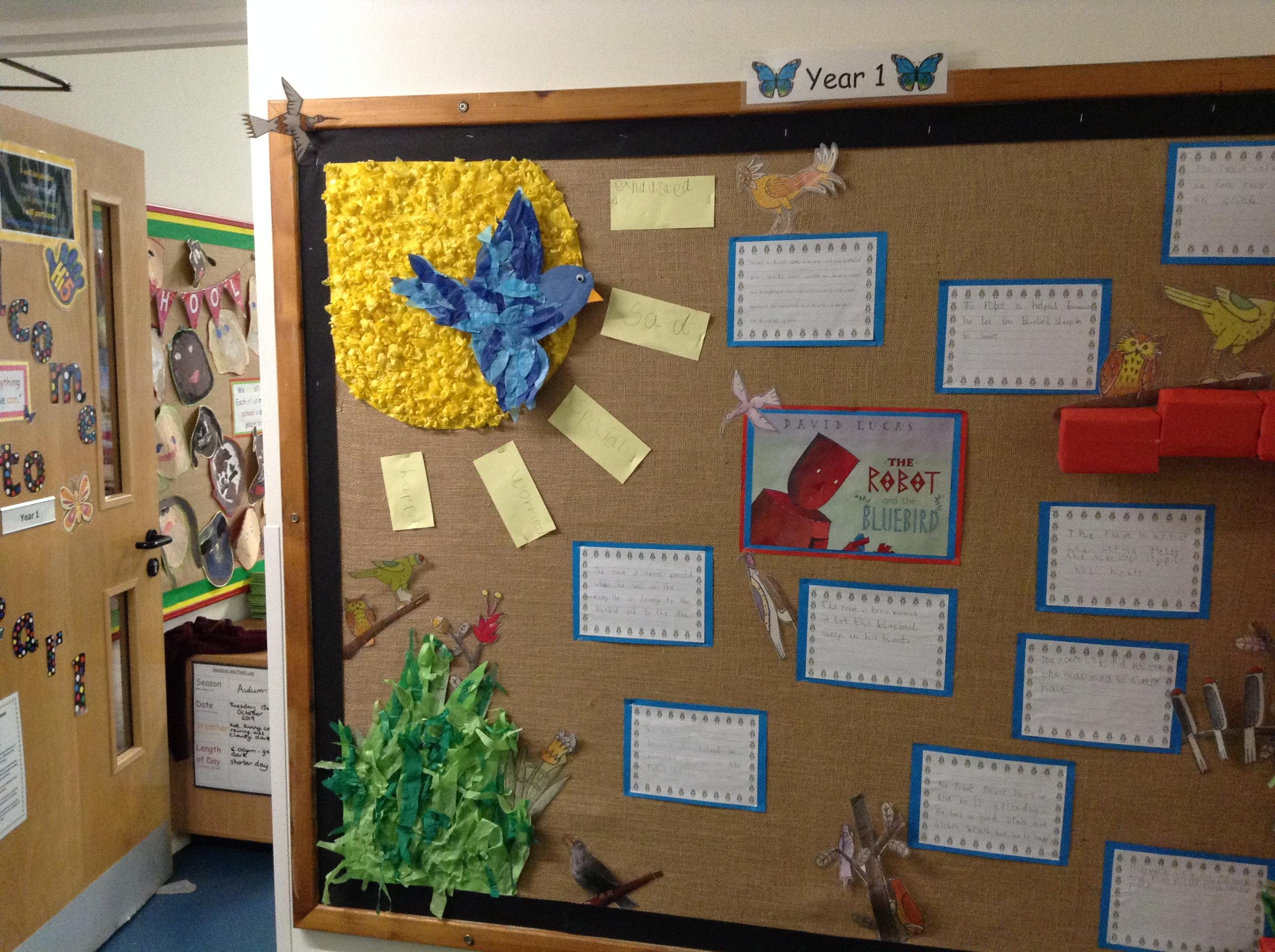 8.11.19: Look at our wonderful display about the book 'The Robot and the Bluebird'. We wrote character descriptions about the robot and we thought about the feelings of the bluebird.
