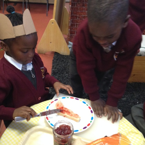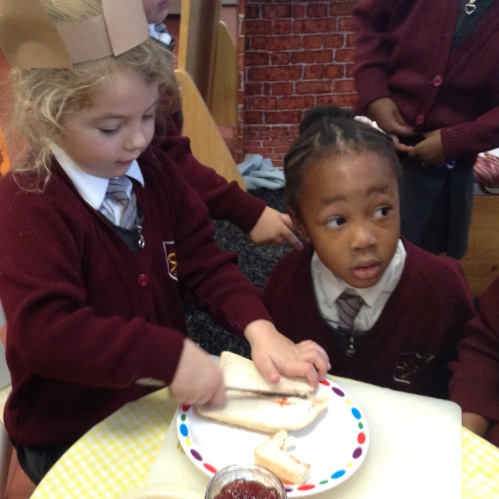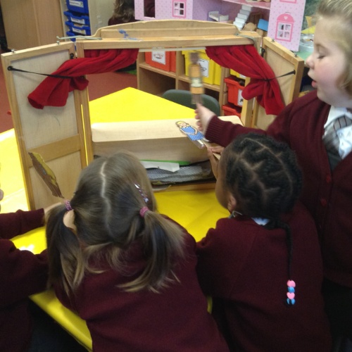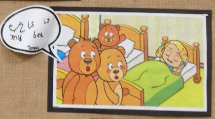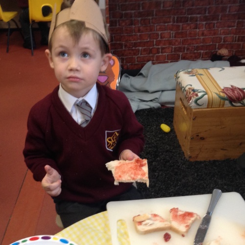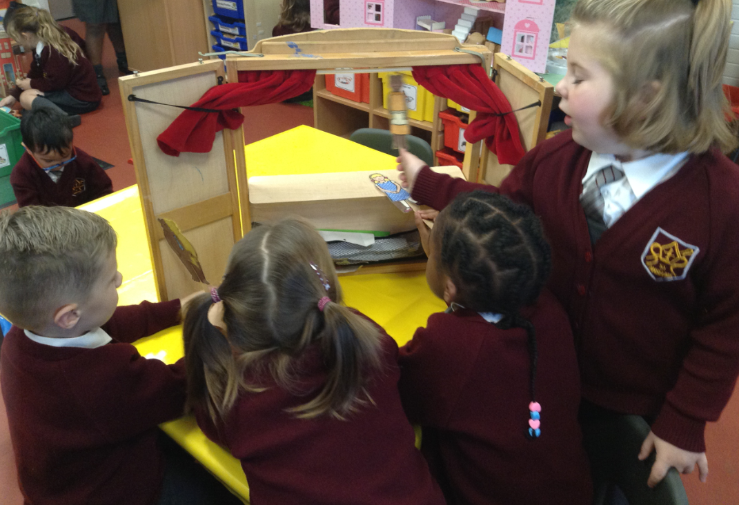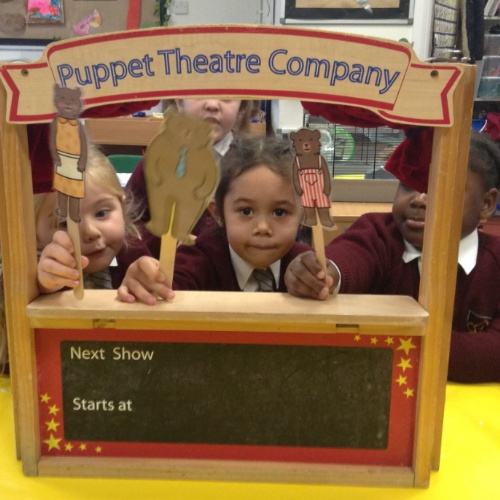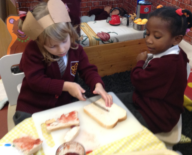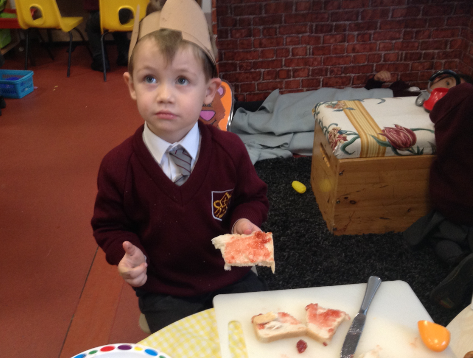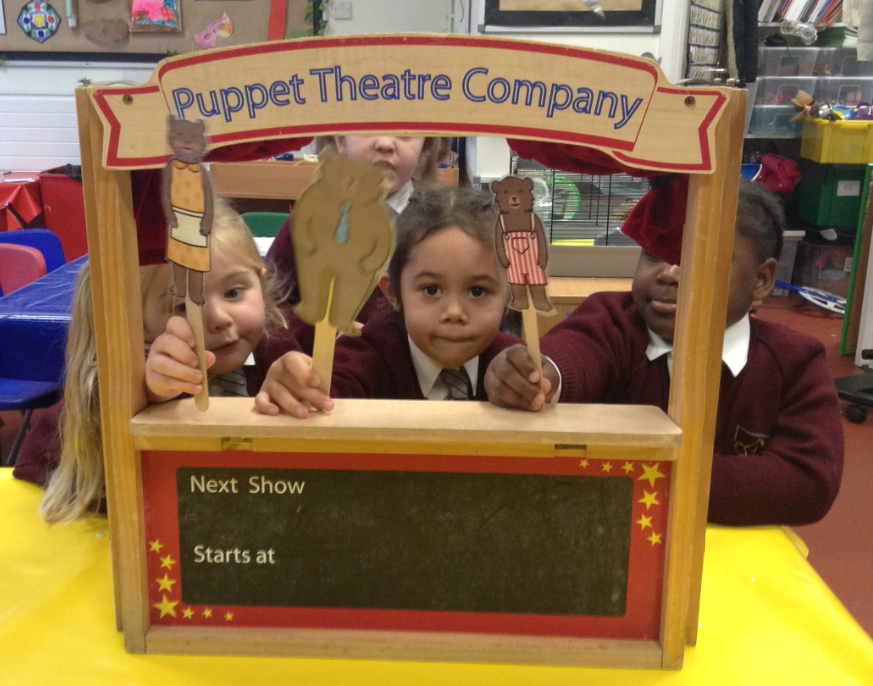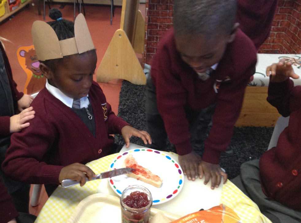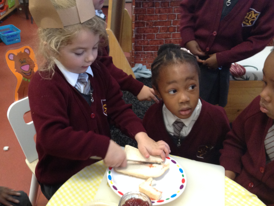This week we have been exploring the story of Goldilocks and the Three Bears to enhance our topic of 'Into the Woods.' We created a story map together and used it to retell the story of Goldilocks using actions and signs. We wrote speech bubbles pretending we were different characters in the story. We retold the story with puppets in our puppet theatre and also set up a 'Mummy Bears' Cafe', where children took orders and made sandwiches for their friends.
