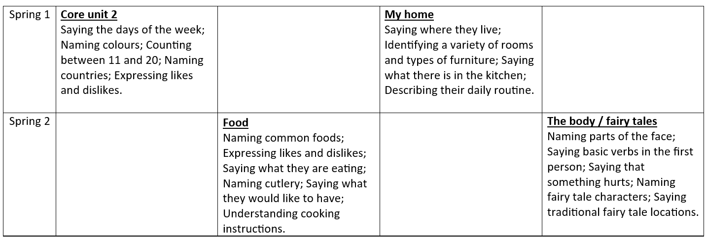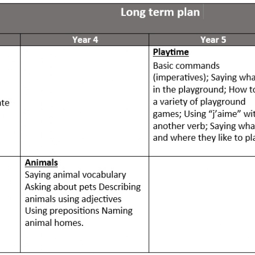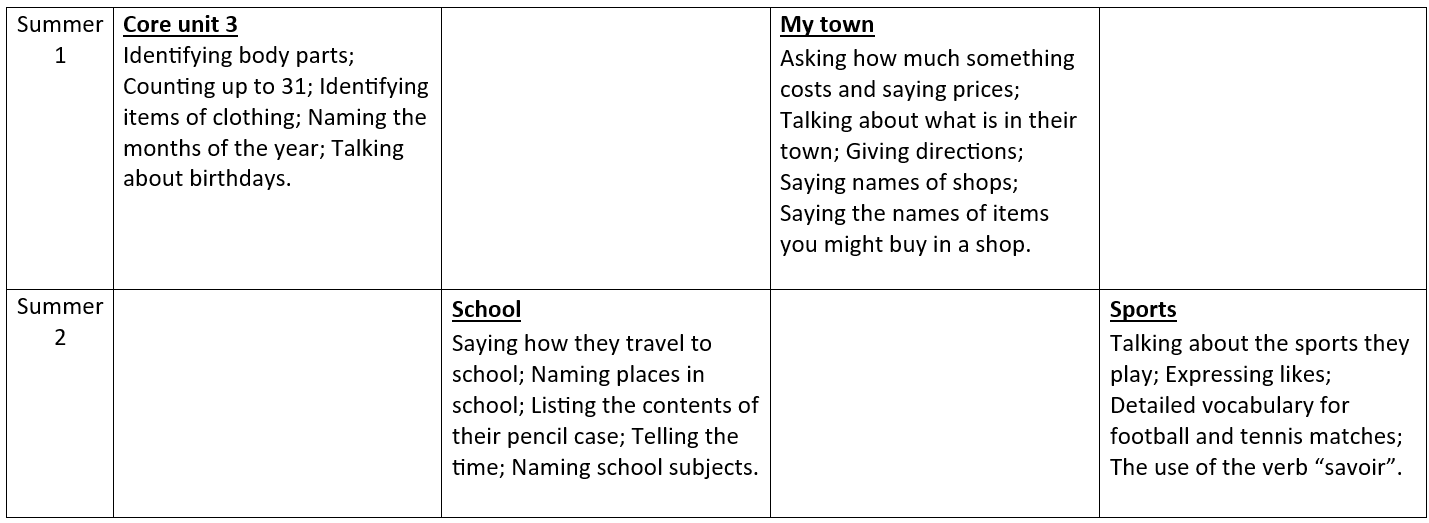 French is taught in all Key Stage 2 classes. Each class covers three units which are taught on alternate terms.