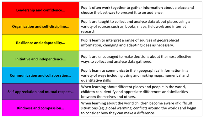 Through a wide variety of activities pupils learn about local places, places in the UK and places in the wider world. They also learn about key geographical processes. Key knowledge and skills have been mapped across the school to ensure progression between year groups.