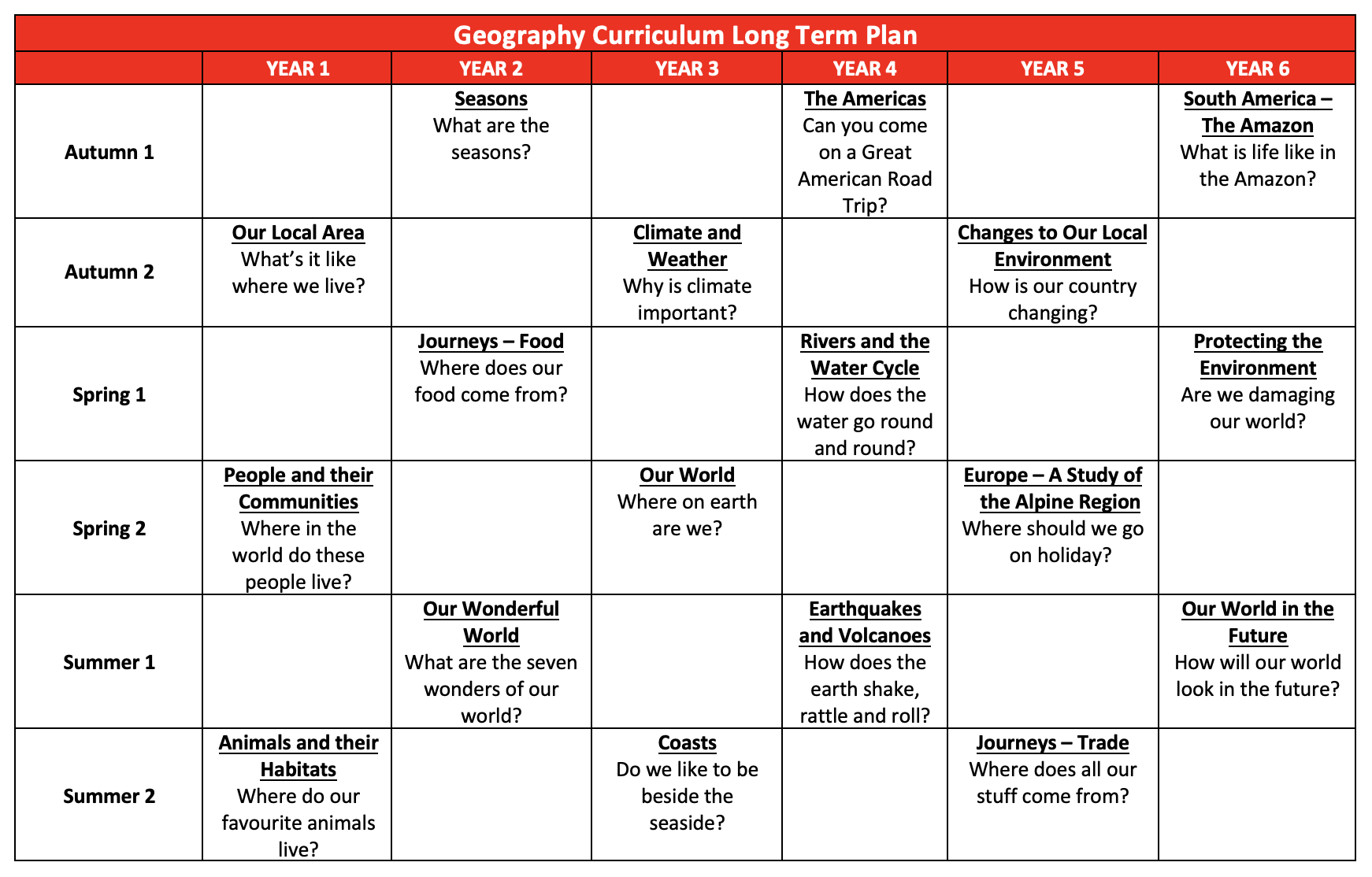 At St. Anselm's, Geography units are taught across Key Stages 1 and 2. There are three units for each year group.