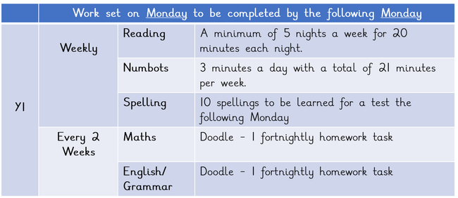 New spellings are introduced on Monday and will be available on Doodle after school that day. They will be tested the following Monday. Alternate weekly maths and English tasks will also be set on Doodle.
