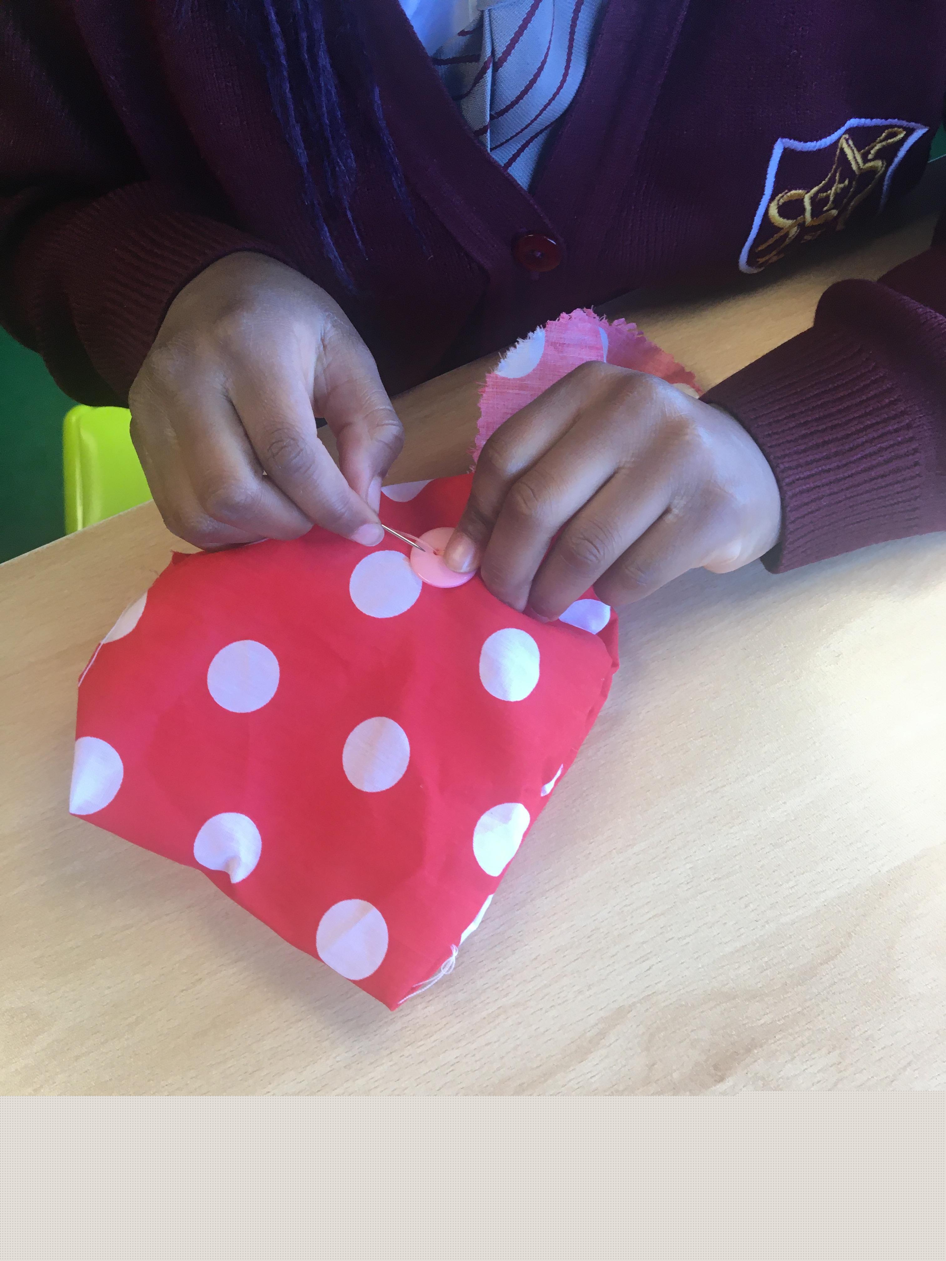 We had to cut around our material and then use different stitches to sew the edges together. From there we added buttons or a press stud to stop the coins from falling out.