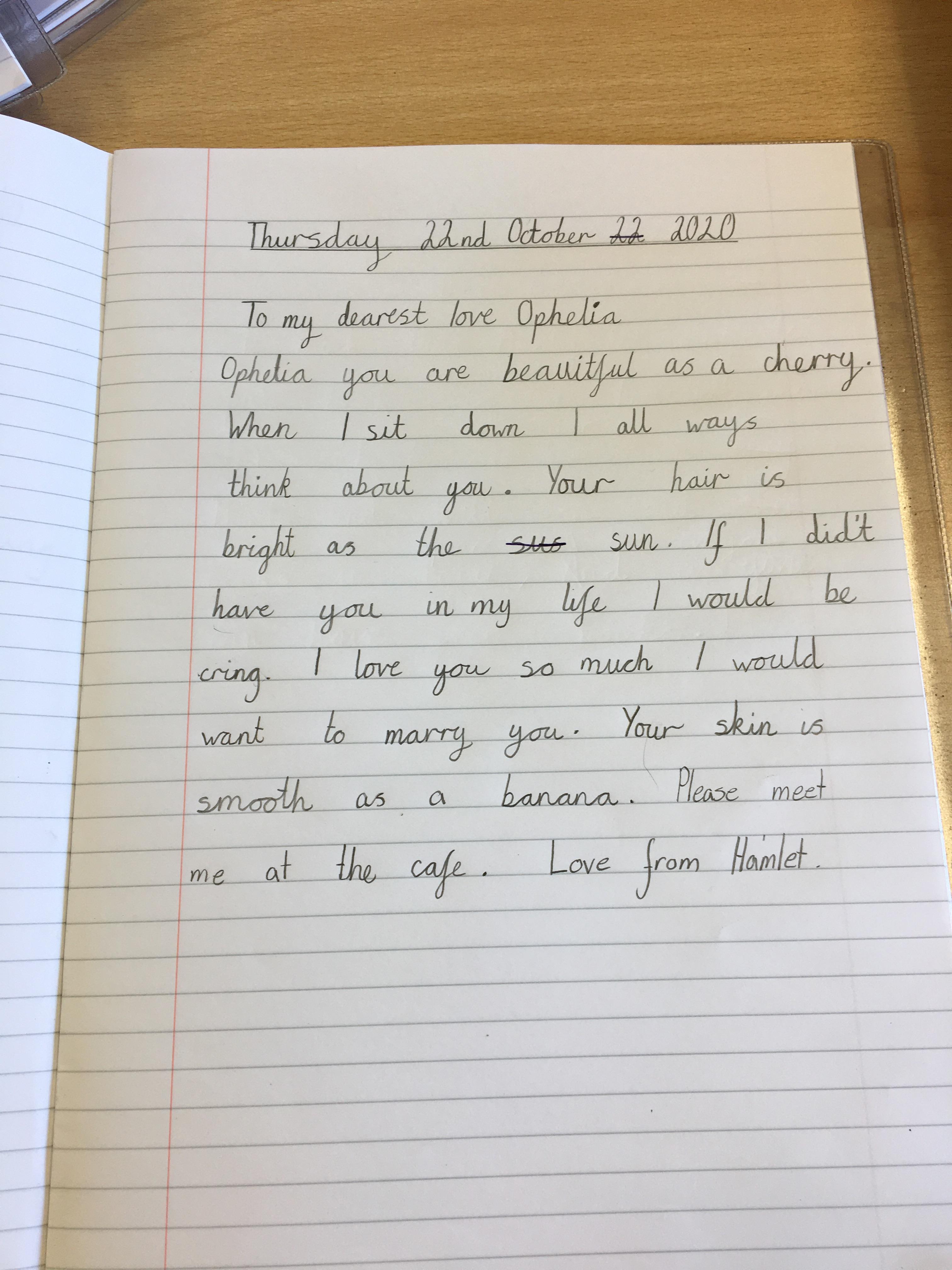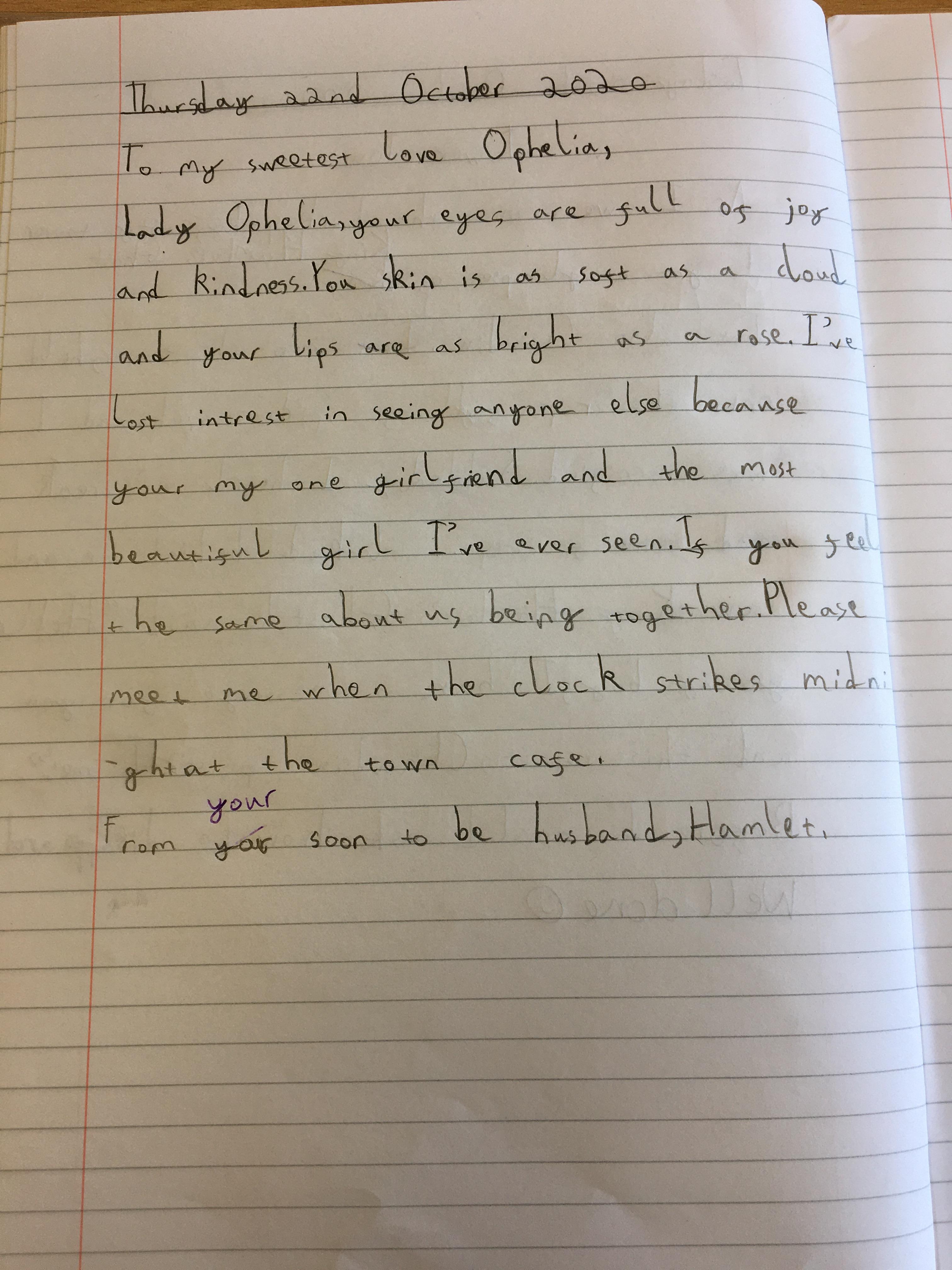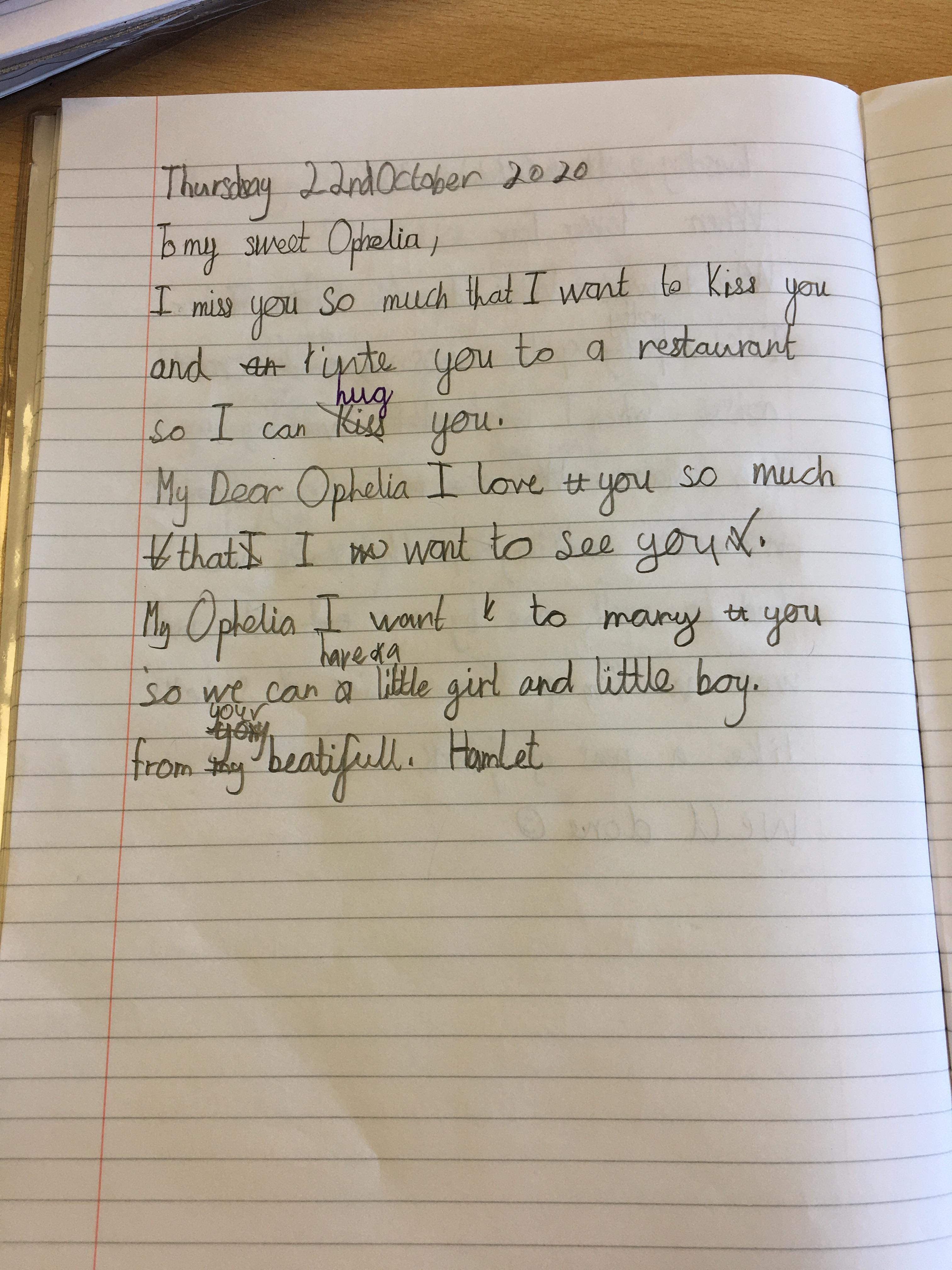 Today we imagined that we were Hamlet and we wrote love letters to Ophelia, telling her how we felt about her.