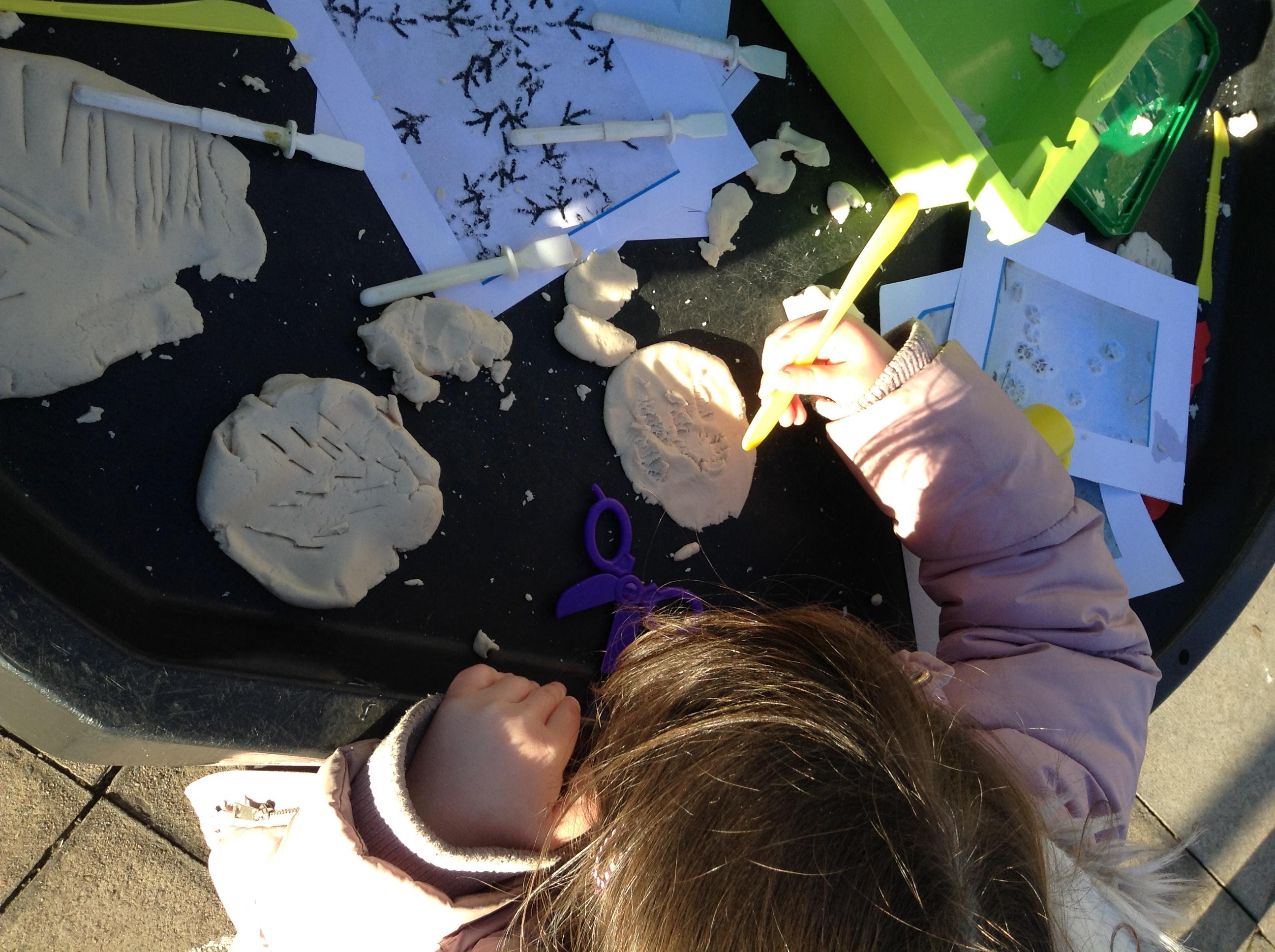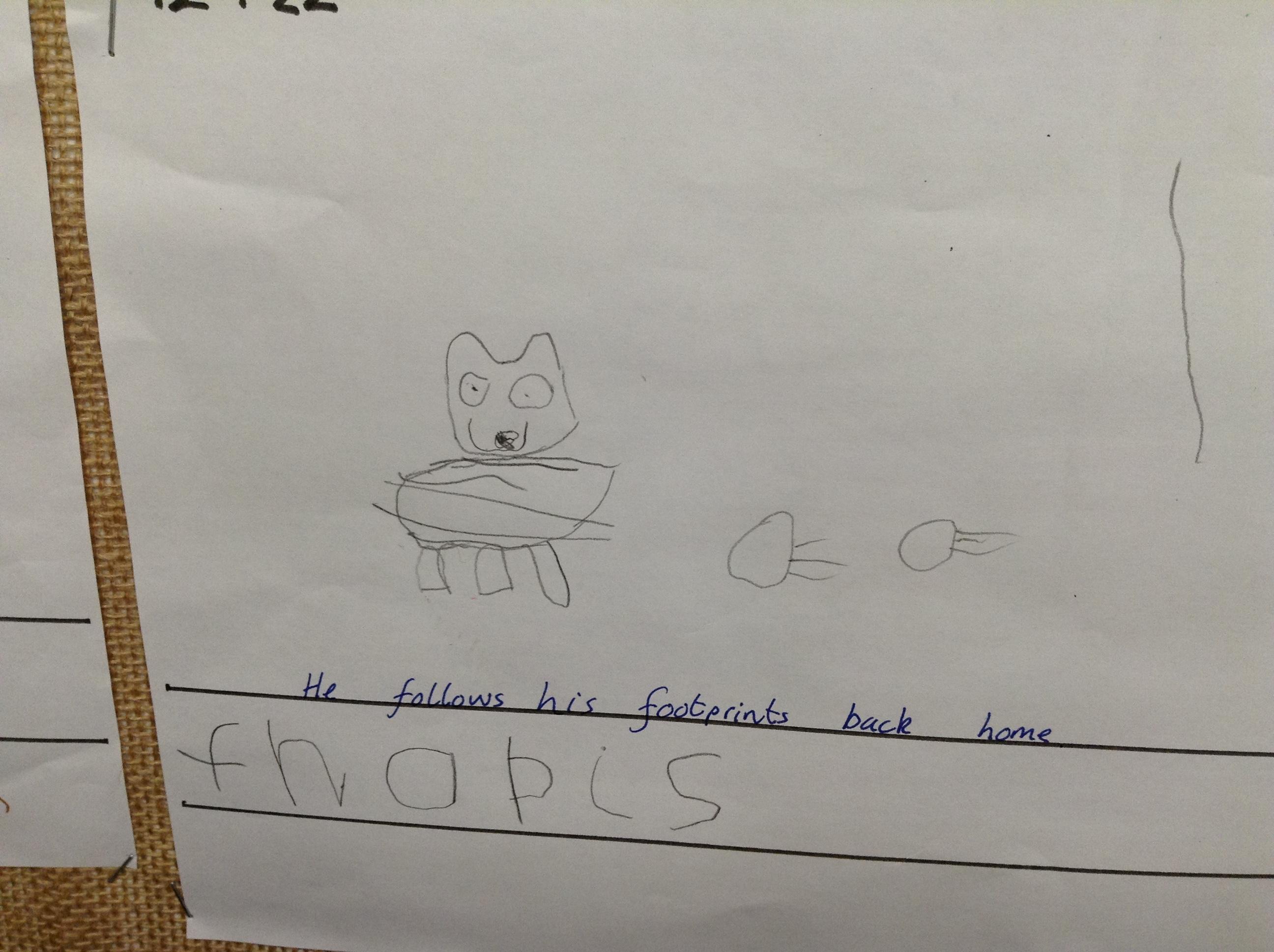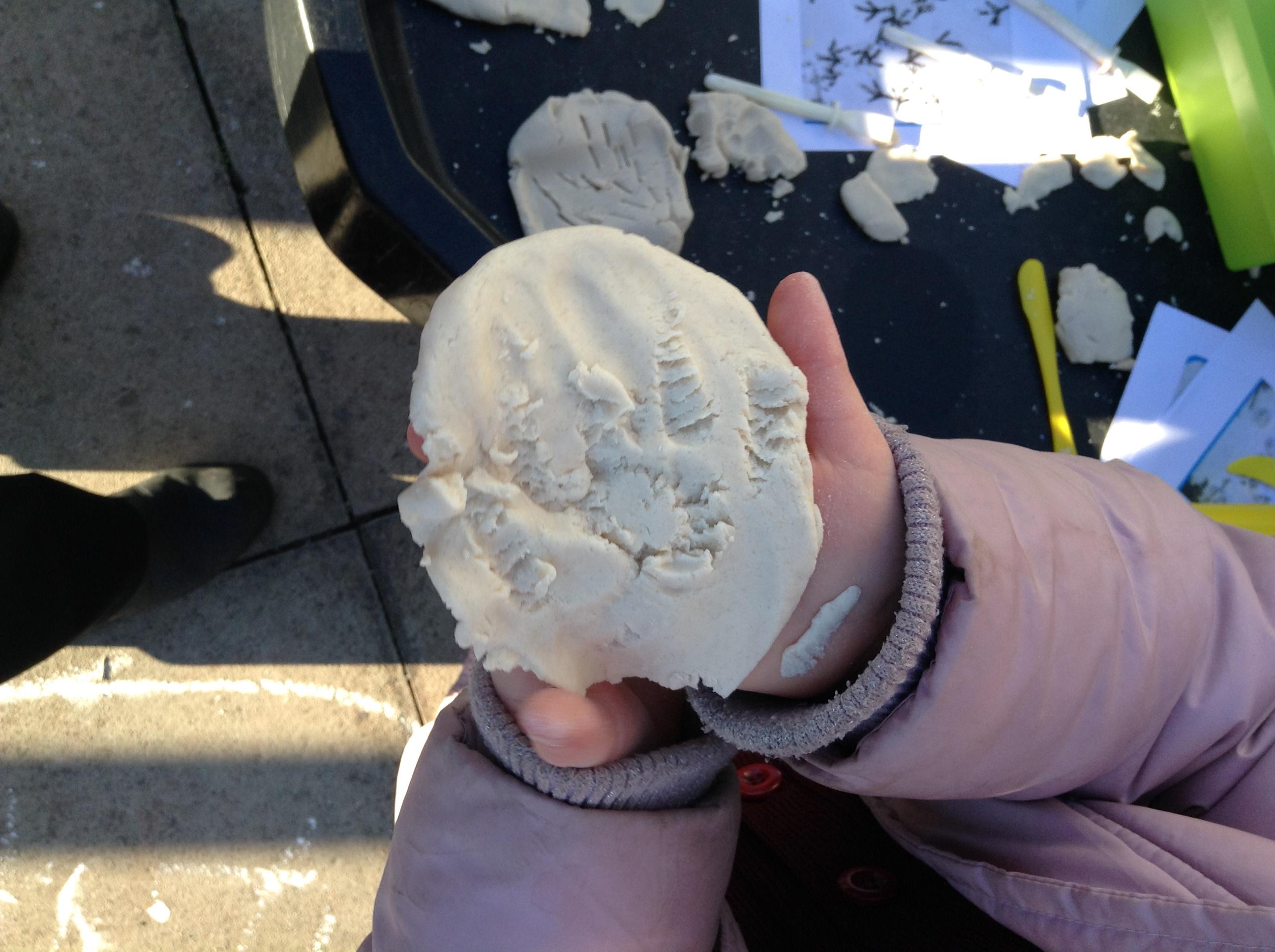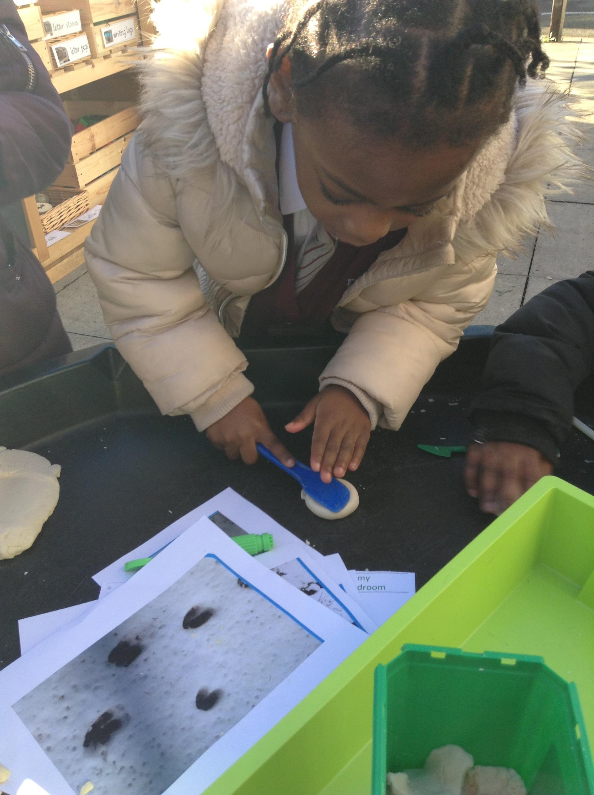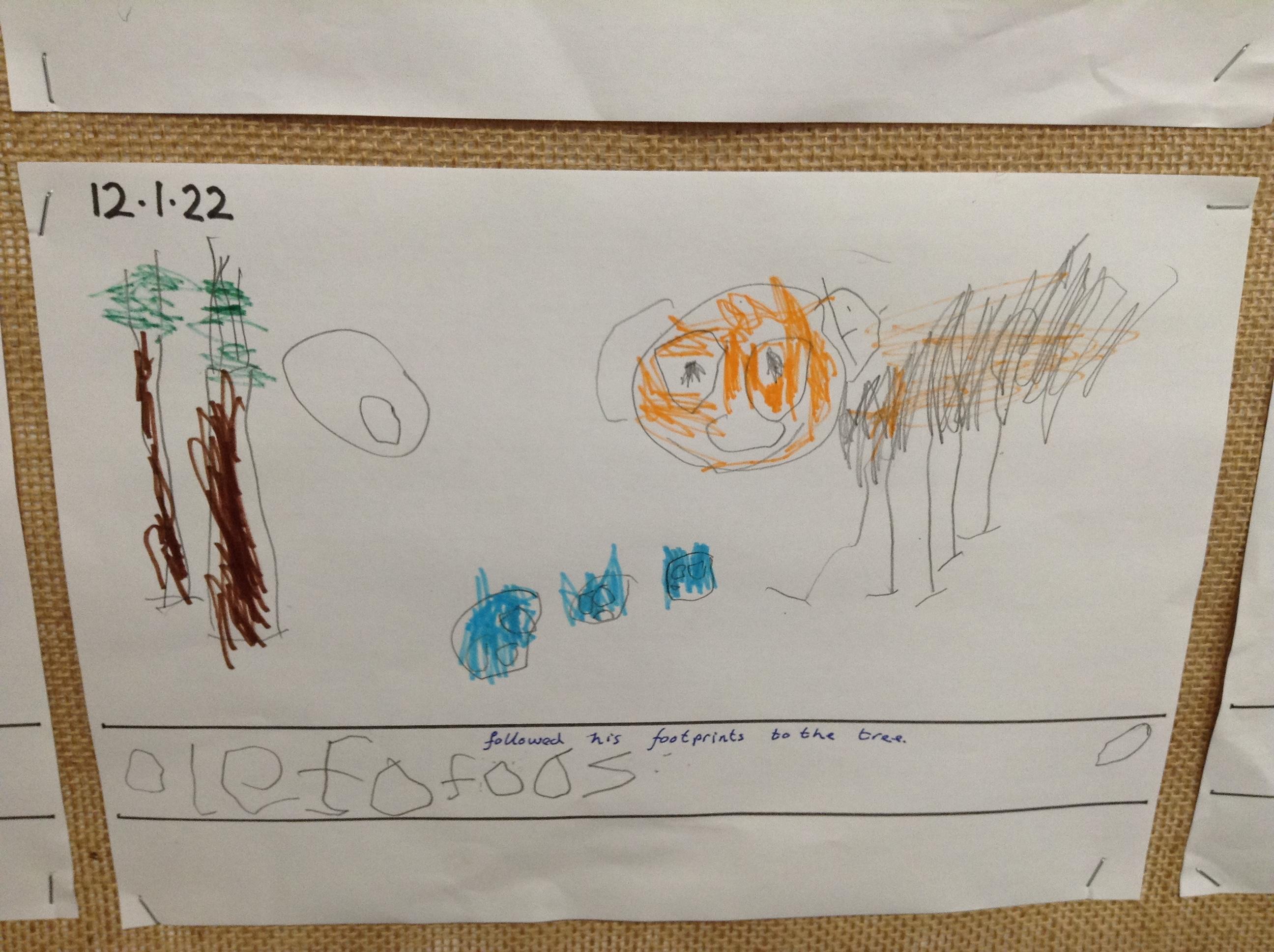 In the story ‘Lost in the Snow’, Ollie, the pup, got lost. We predicted how he might get back to his mum and drew pictures and did some writing to show how. We also made some animal footprints from playdough and using chalk.