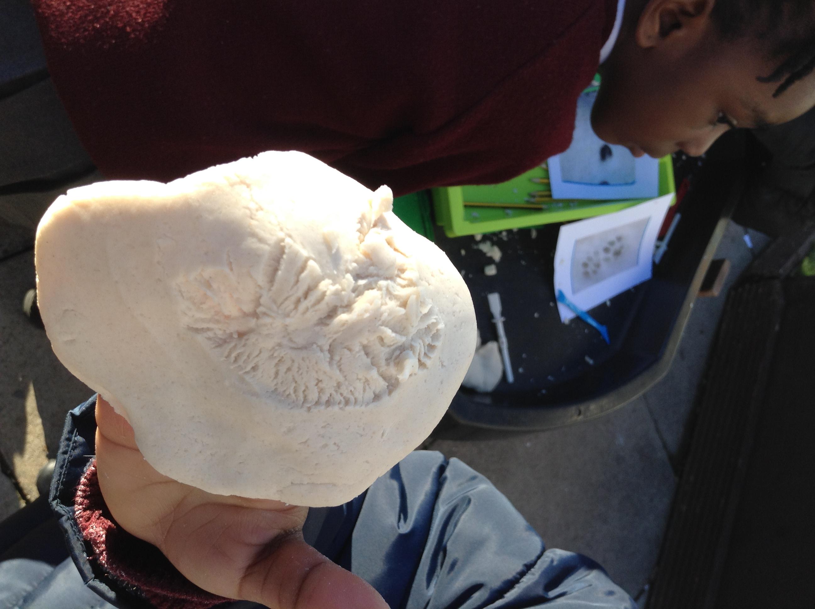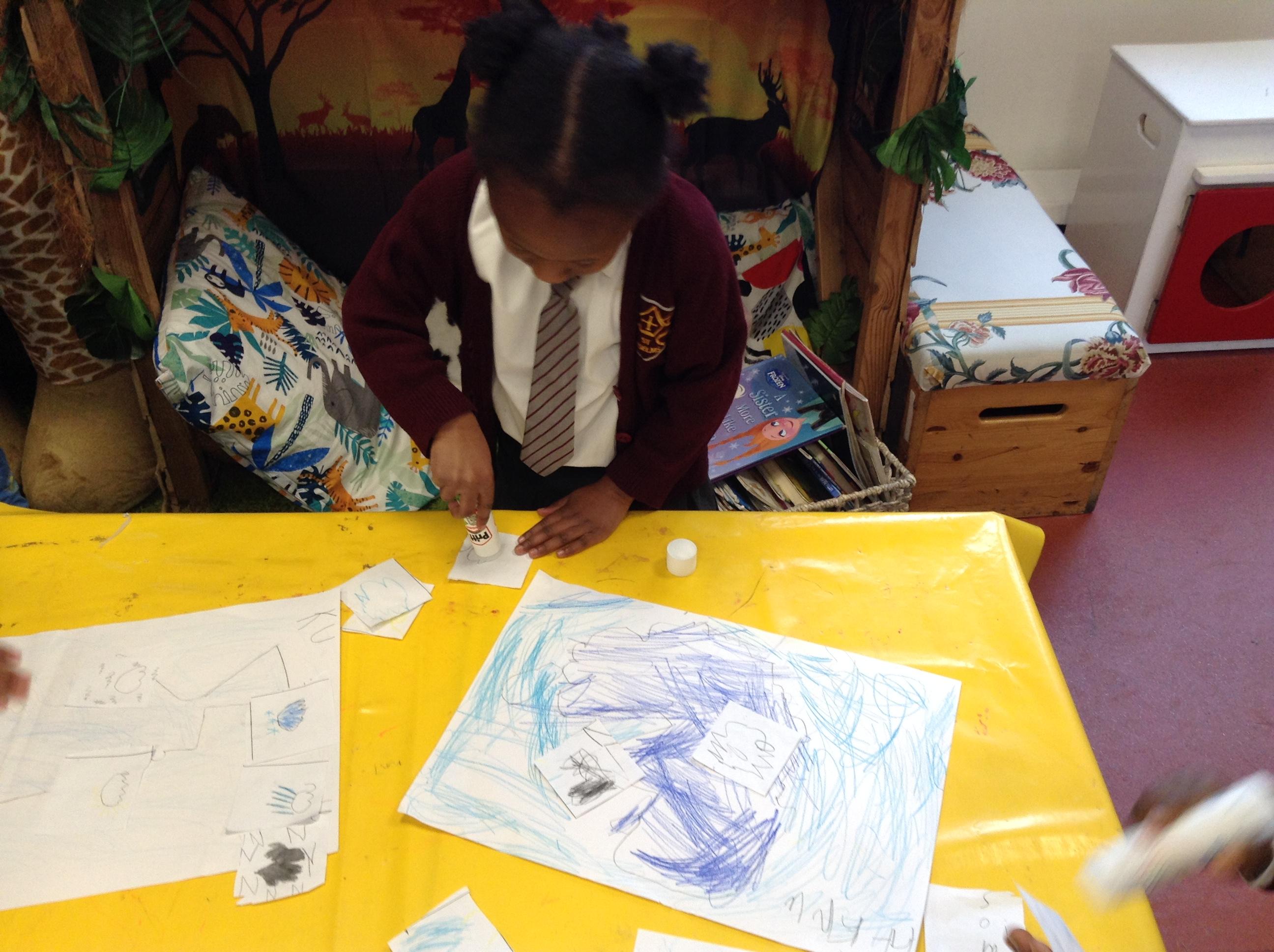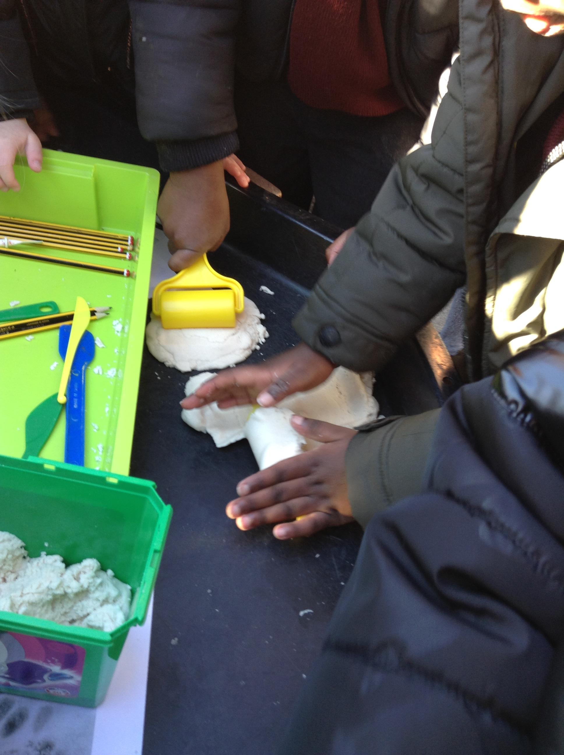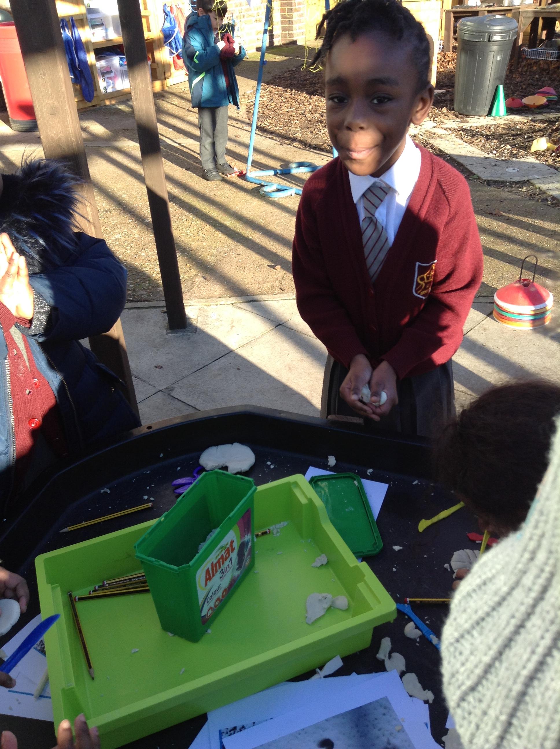 In the story ‘Lost in the Snow’, Ollie, the pup, got lost. We predicted how he might get back to his mum and drew pictures and did some writing to show how. We also made some animal footprints from playdough and using chalk.
