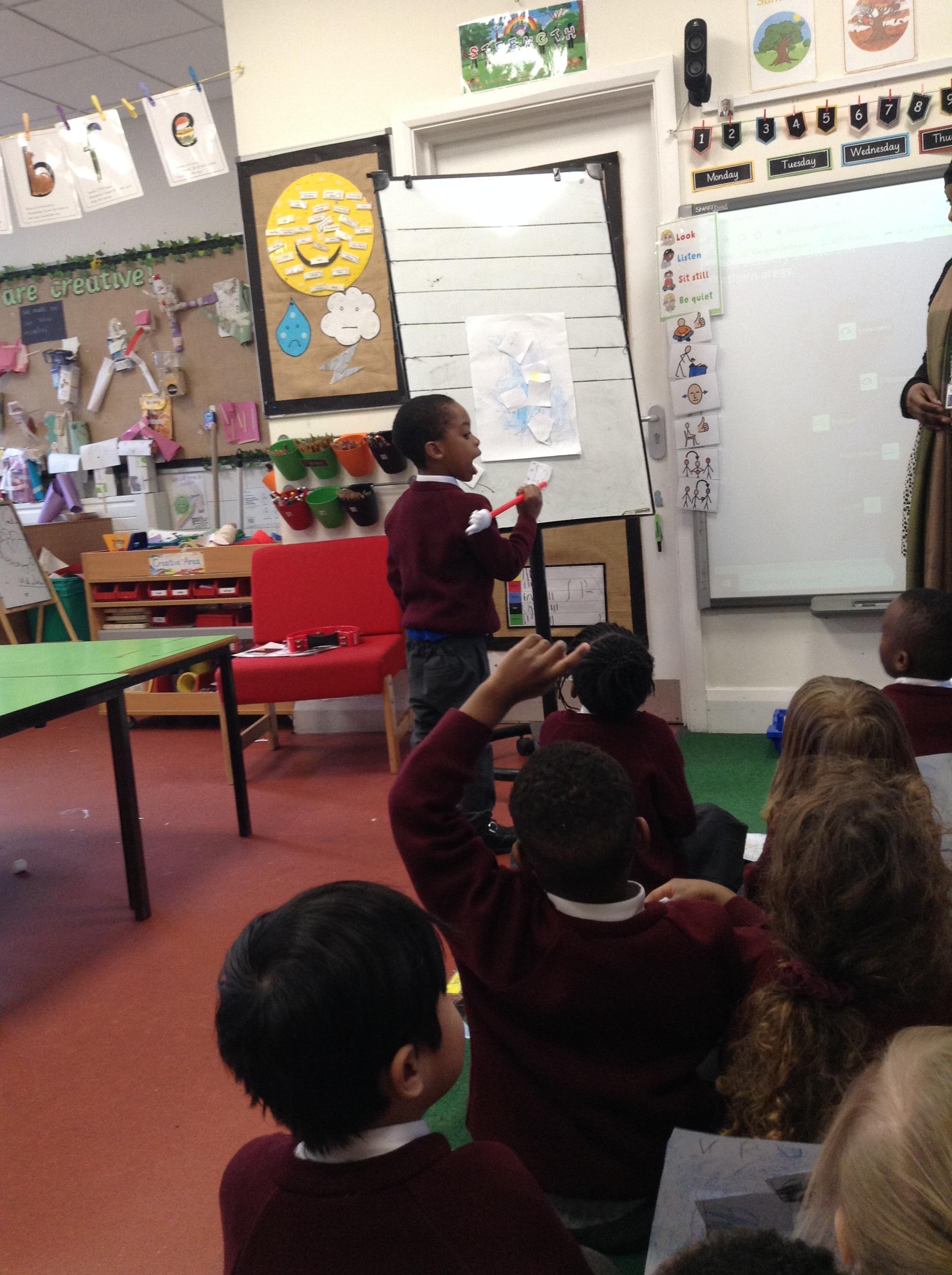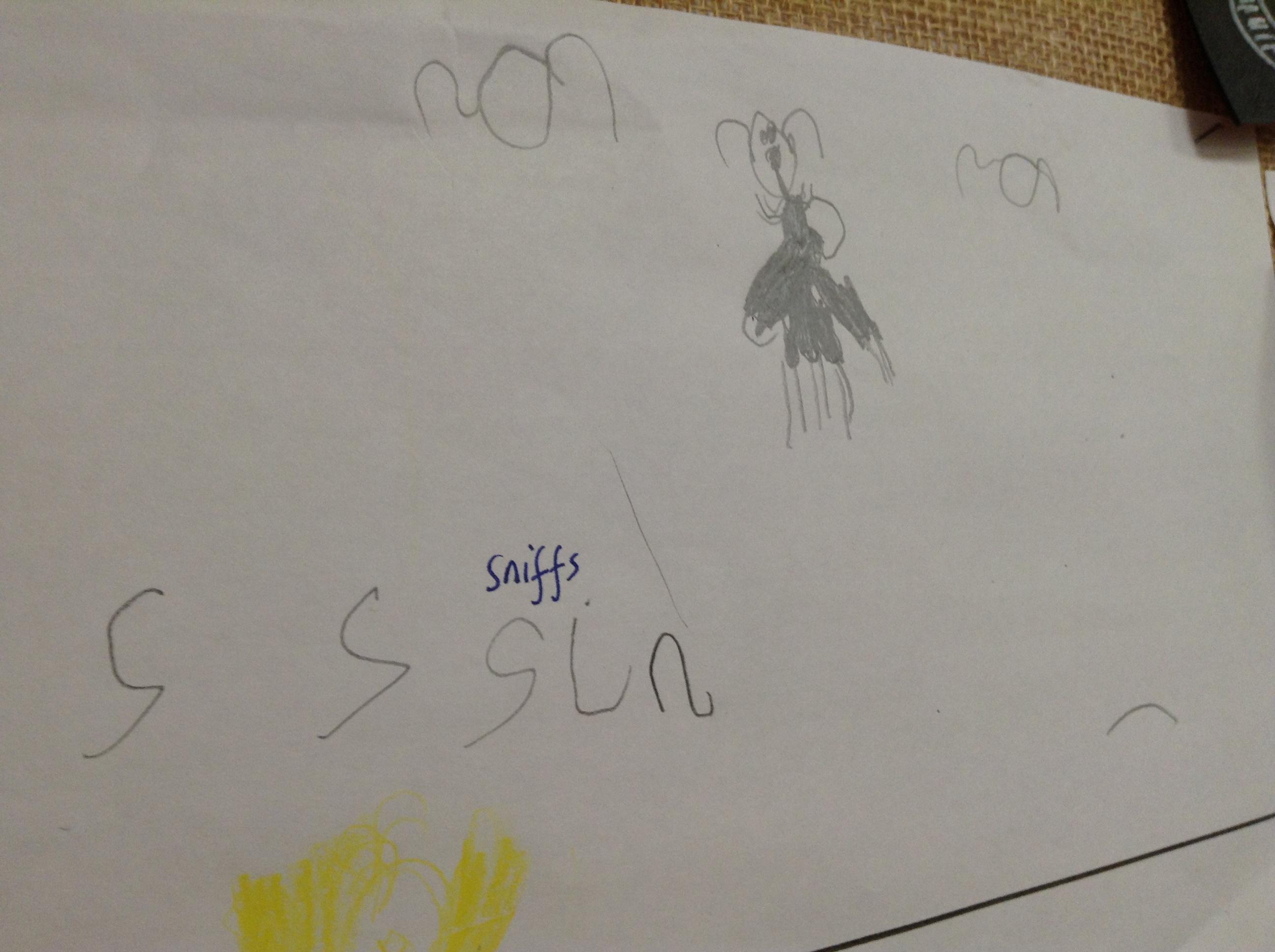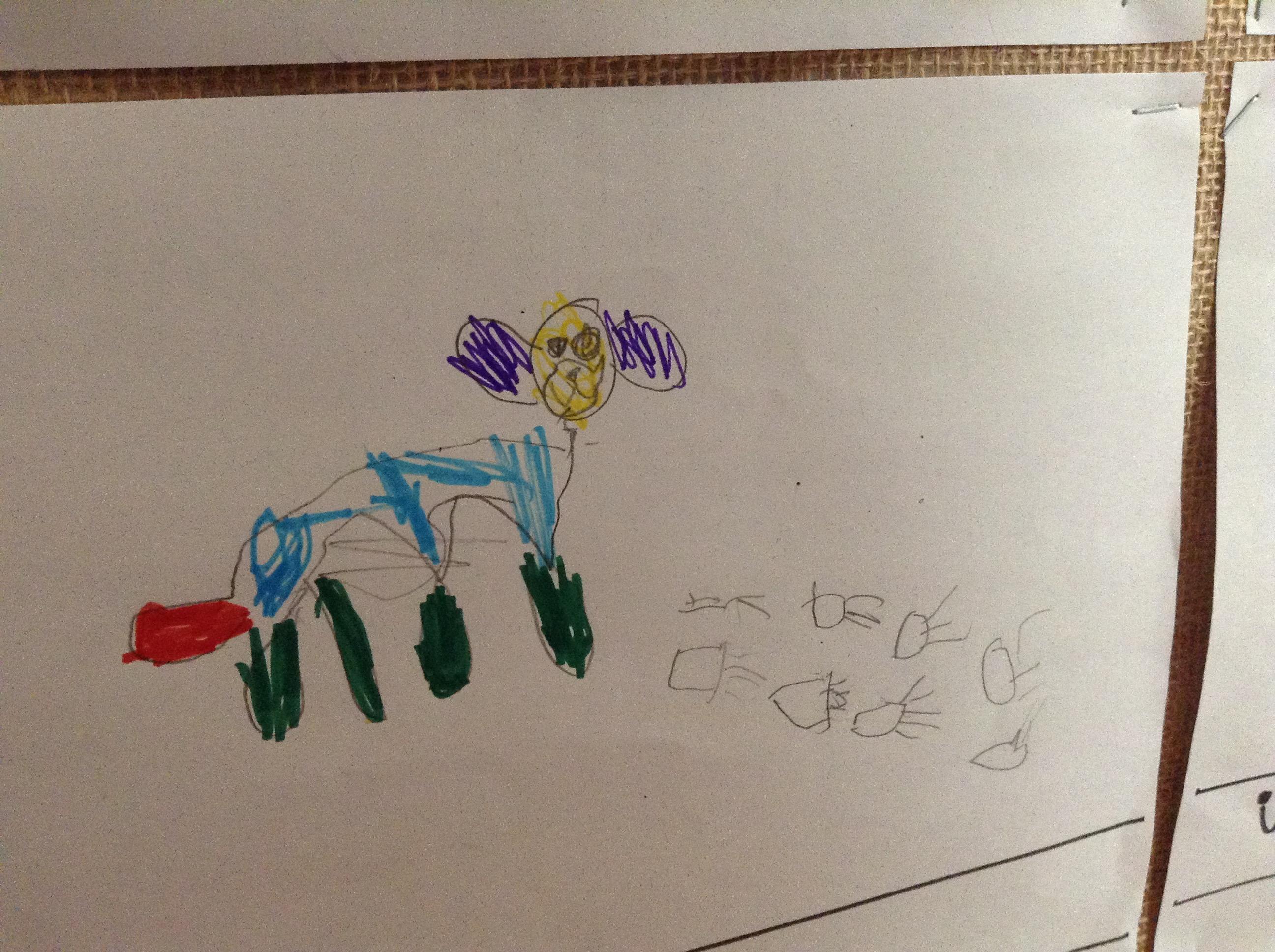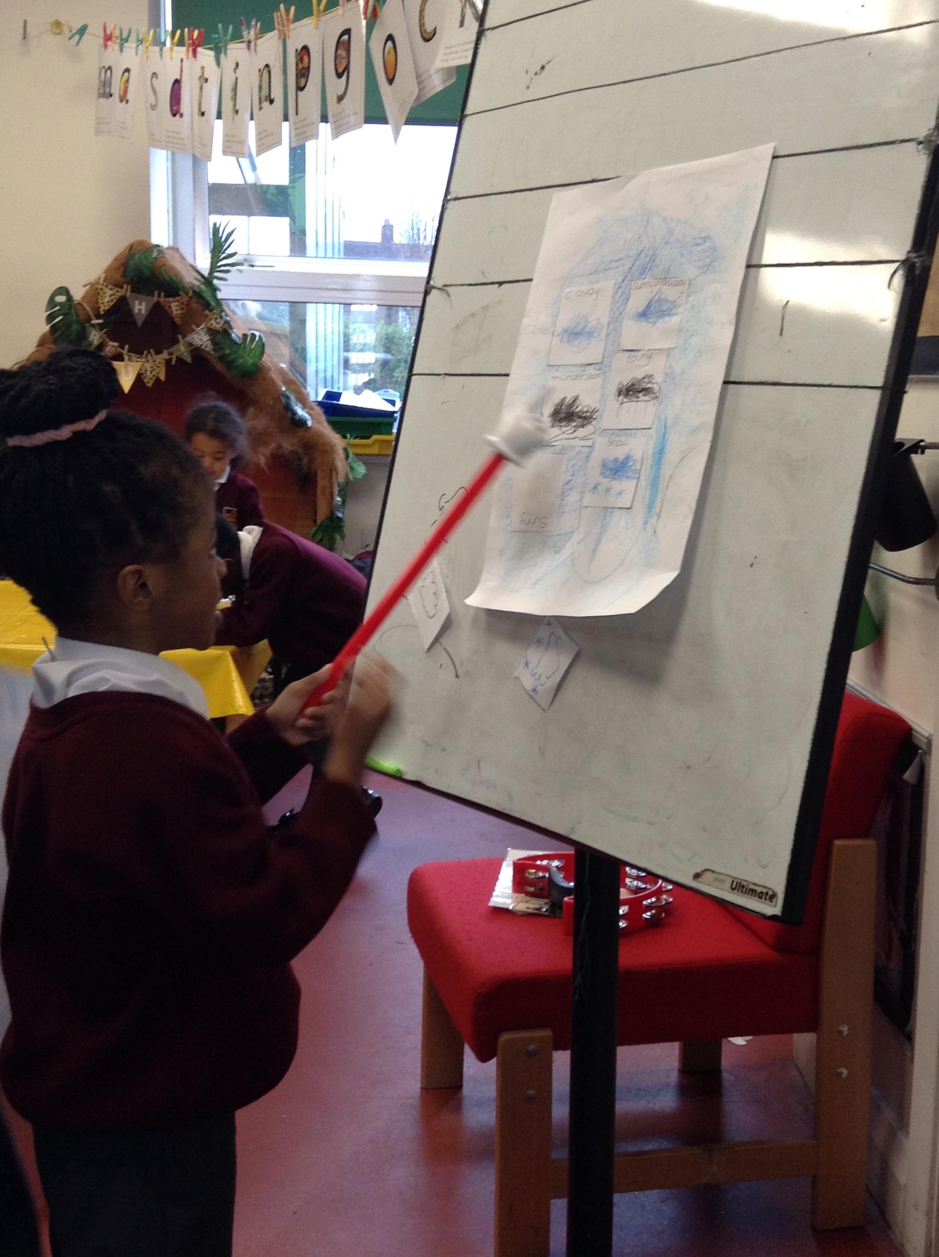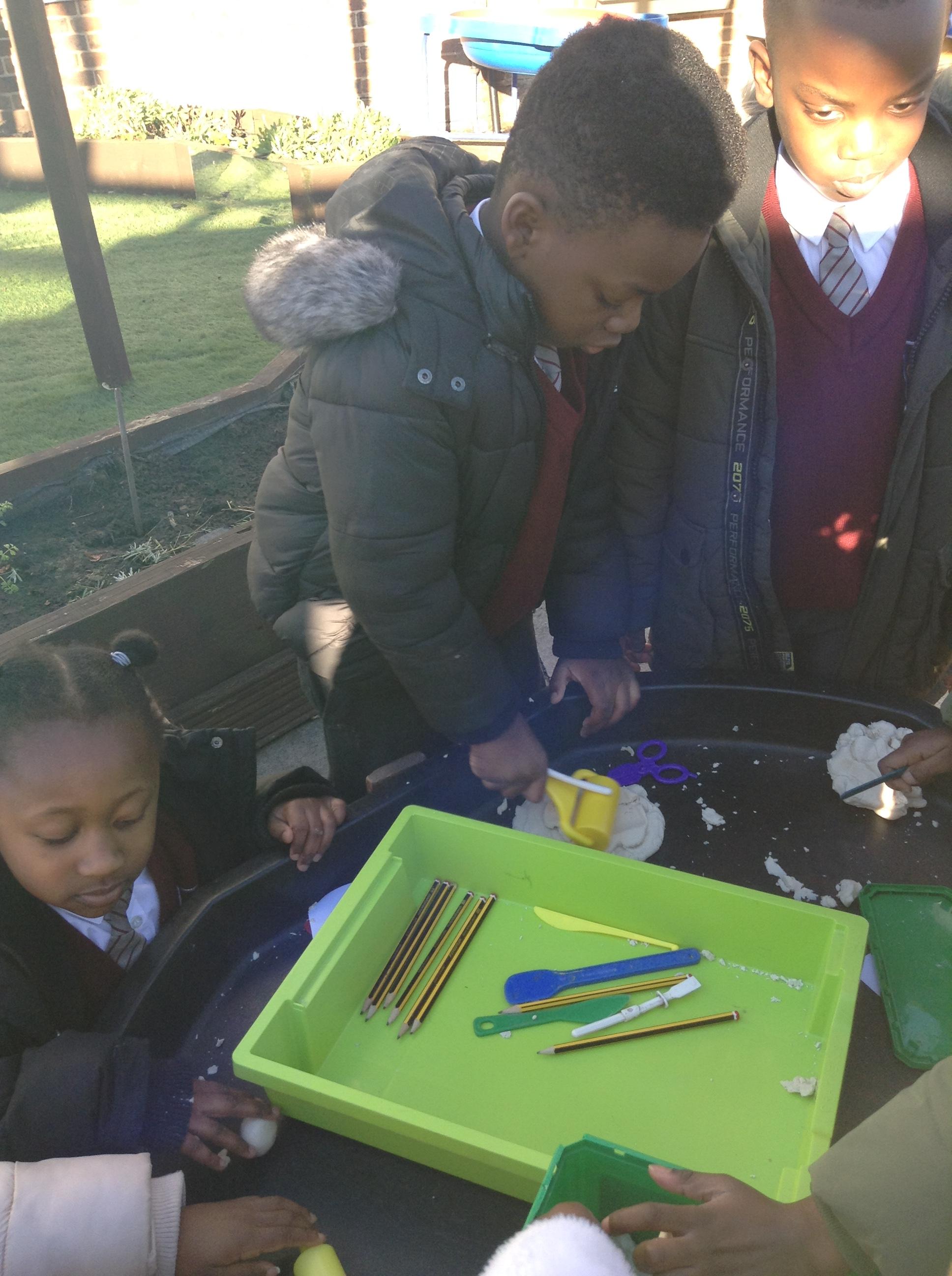 In the story ‘Lost in the Snow’, Ollie, the pup, got lost. We predicted how he might get back to his mum and drew pictures and did some writing to show how. We also made some animal footprints from playdough and using chalk.
