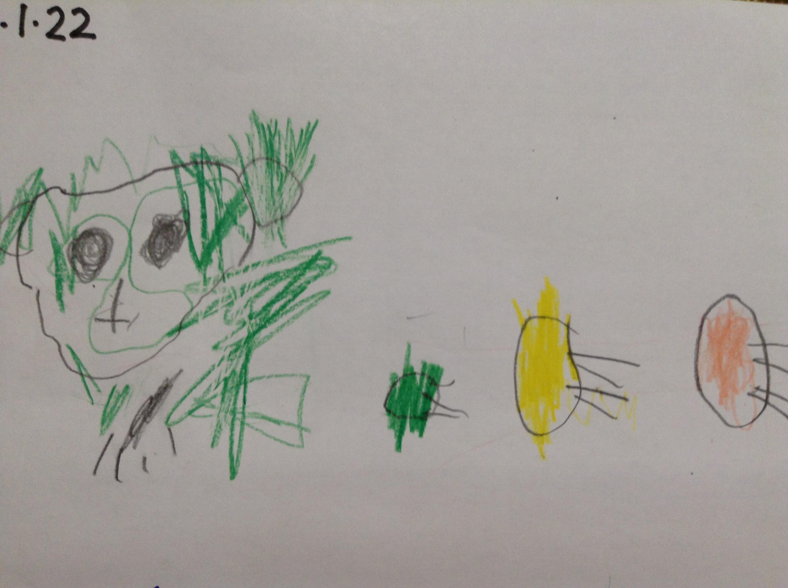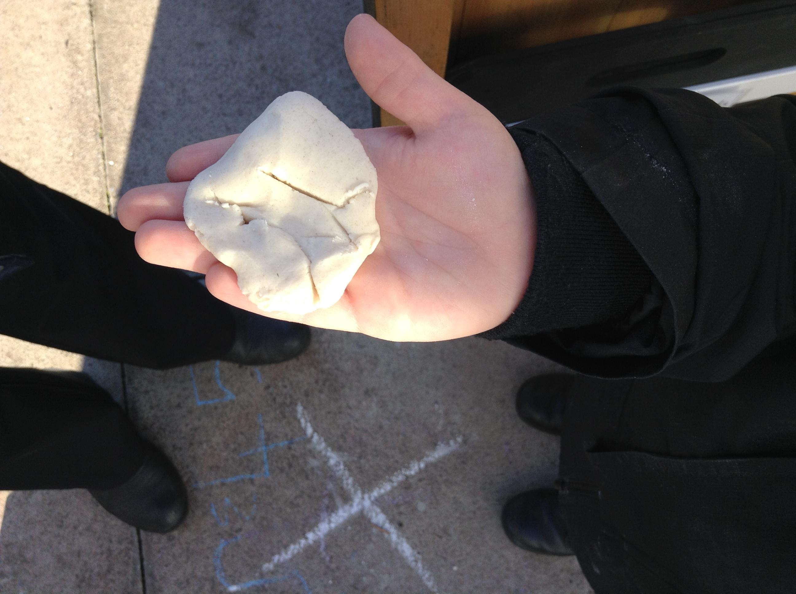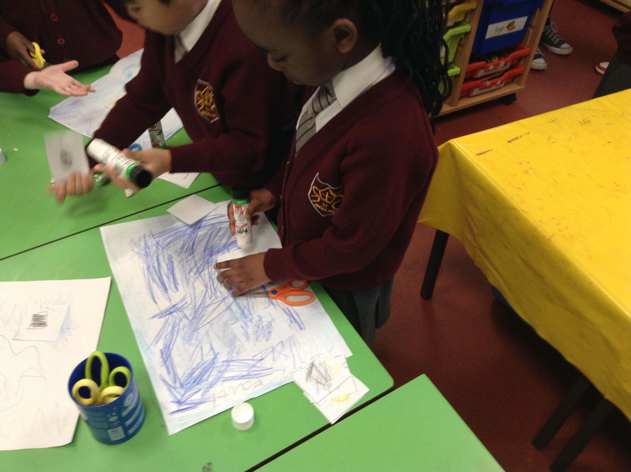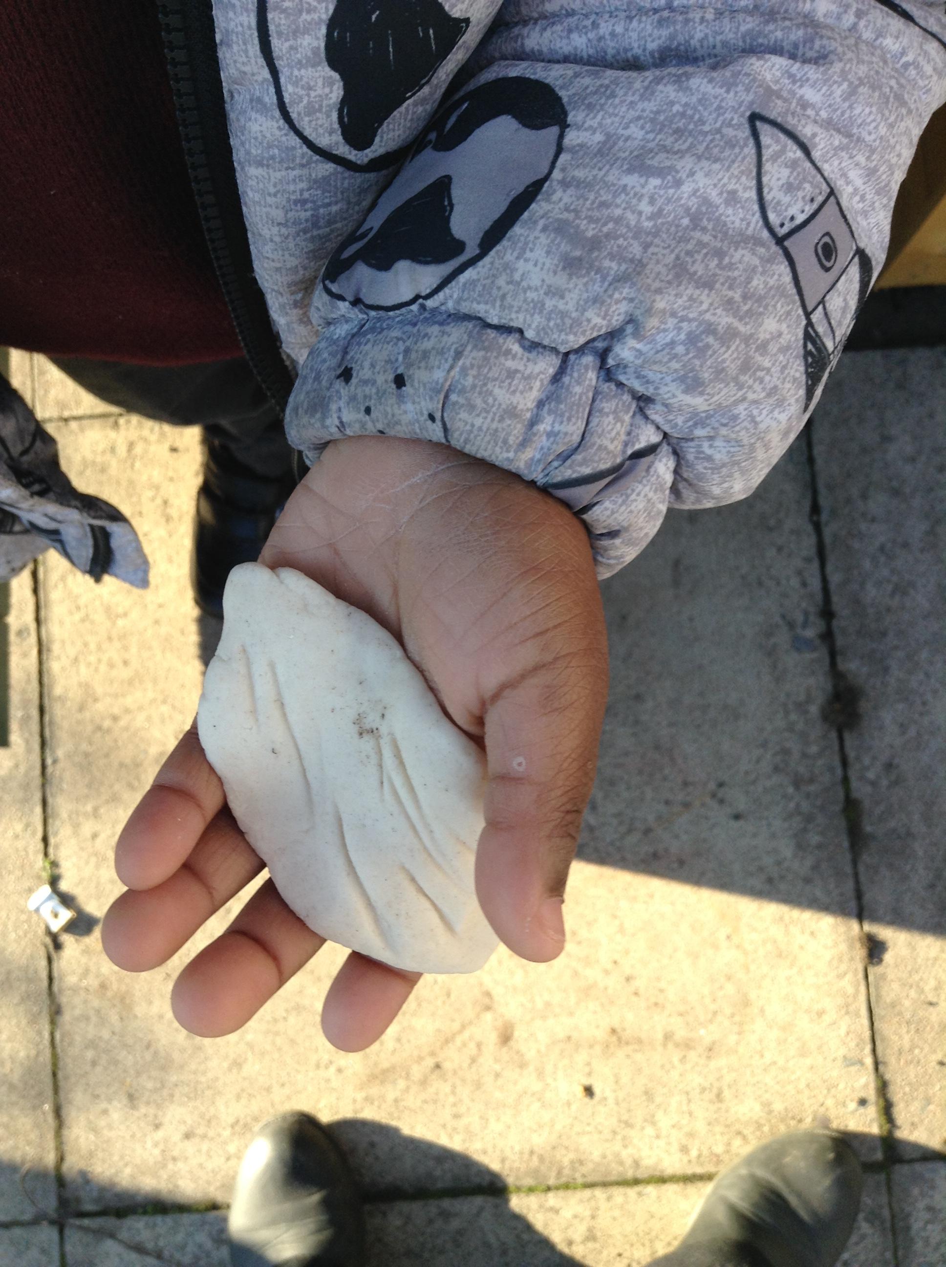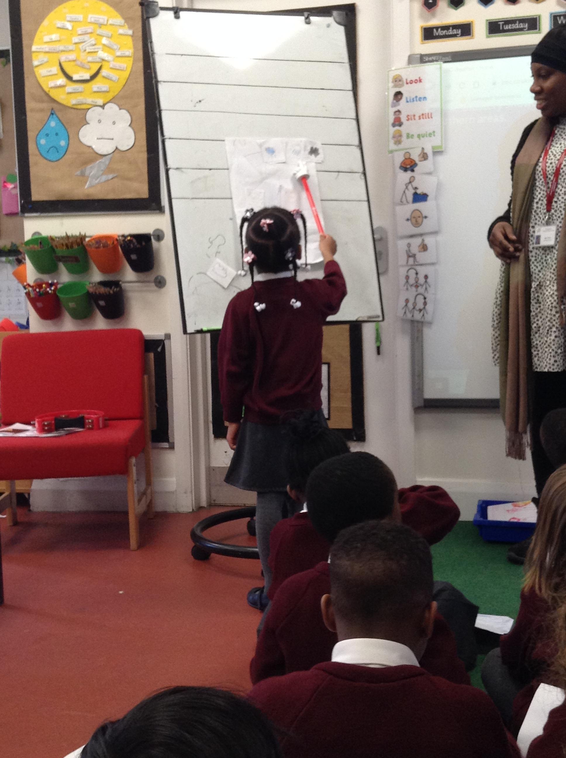 In the story ‘Lost in the Snow’, Ollie, the pup, got lost. We predicted how he might get back to his mum and drew pictures and did some writing to show how. We also made some animal footprints from playdough and using chalk.