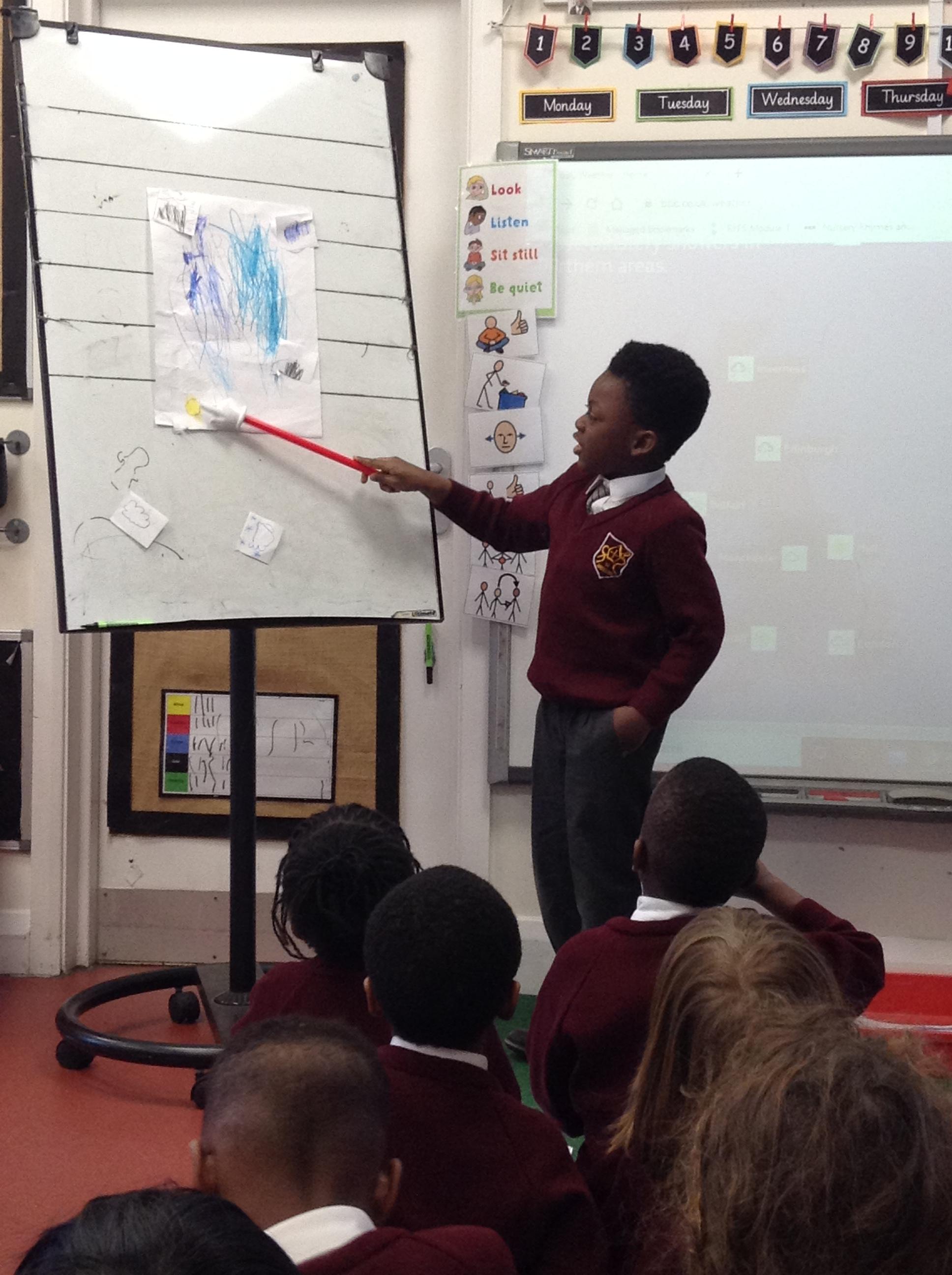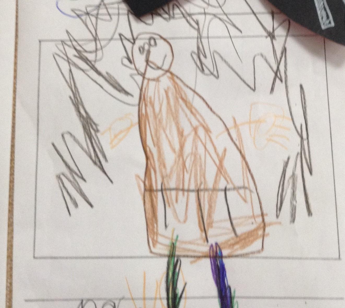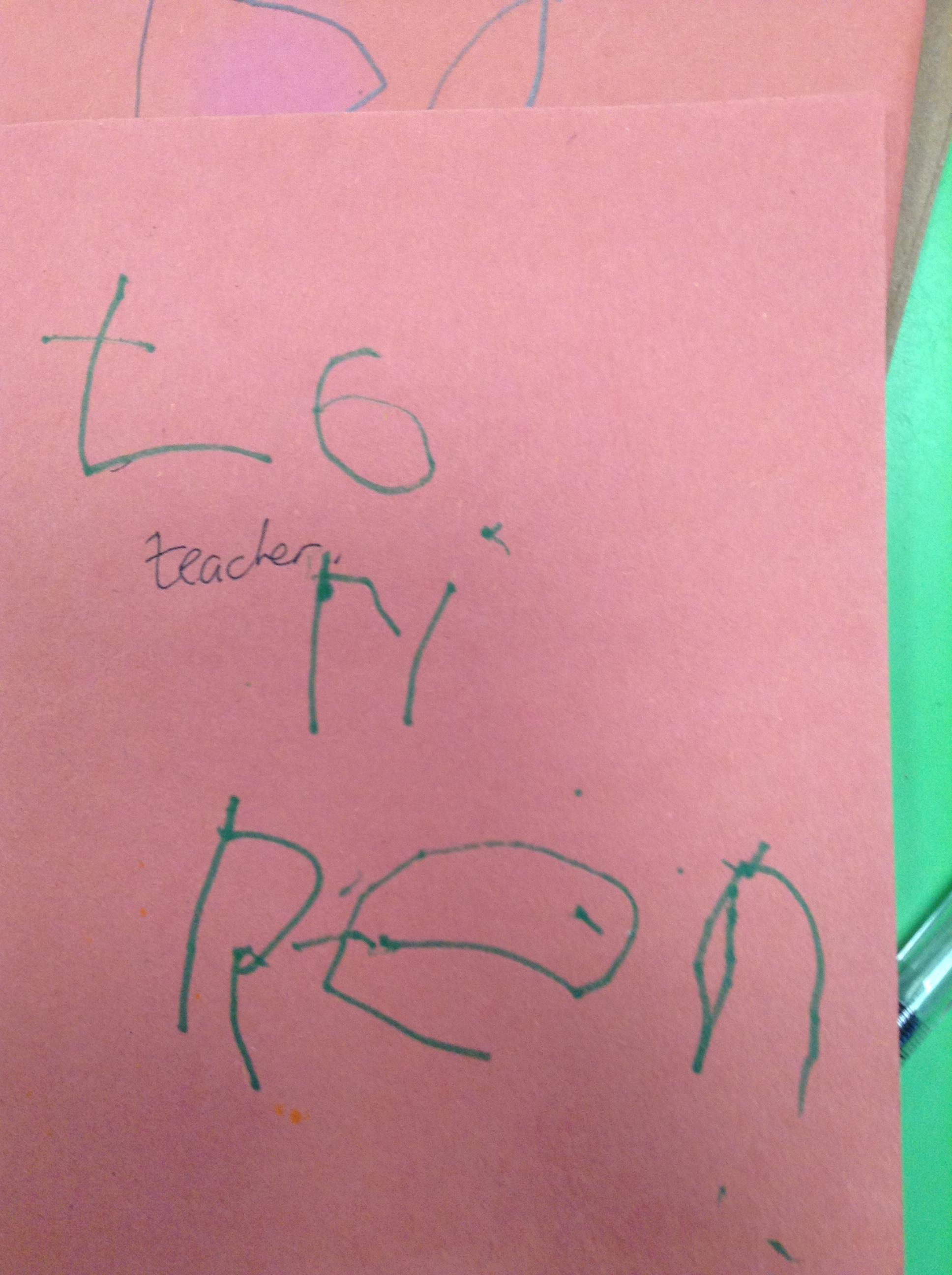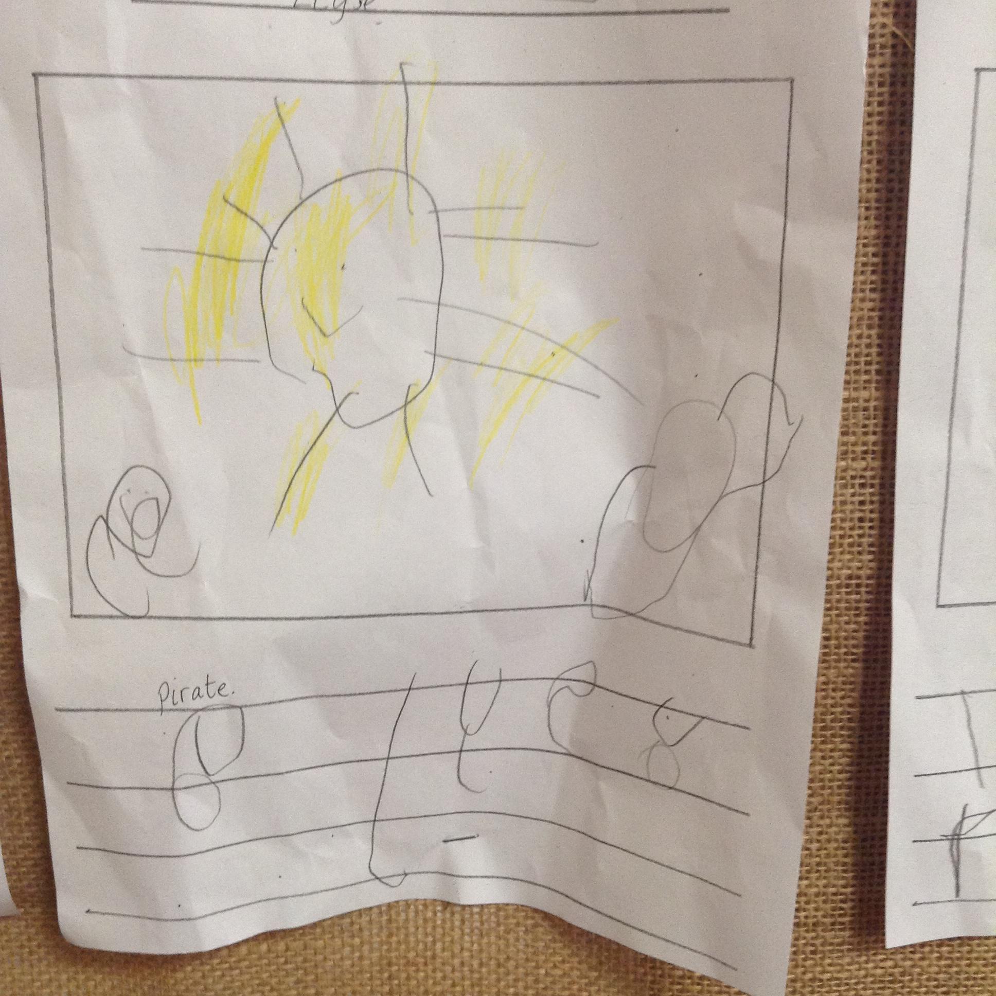 In the story ‘Lost in the Snow’, Ollie, the pup, got lost. We predicted how he might get back to his mum and drew pictures and did some writing to show how. We also made some animal footprints from playdough and using chalk.