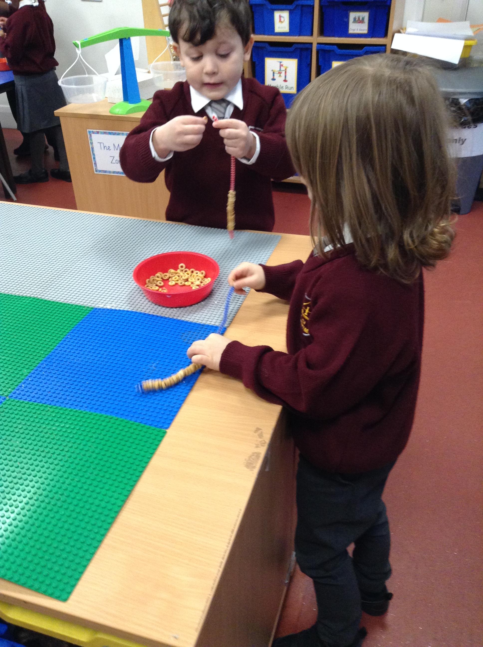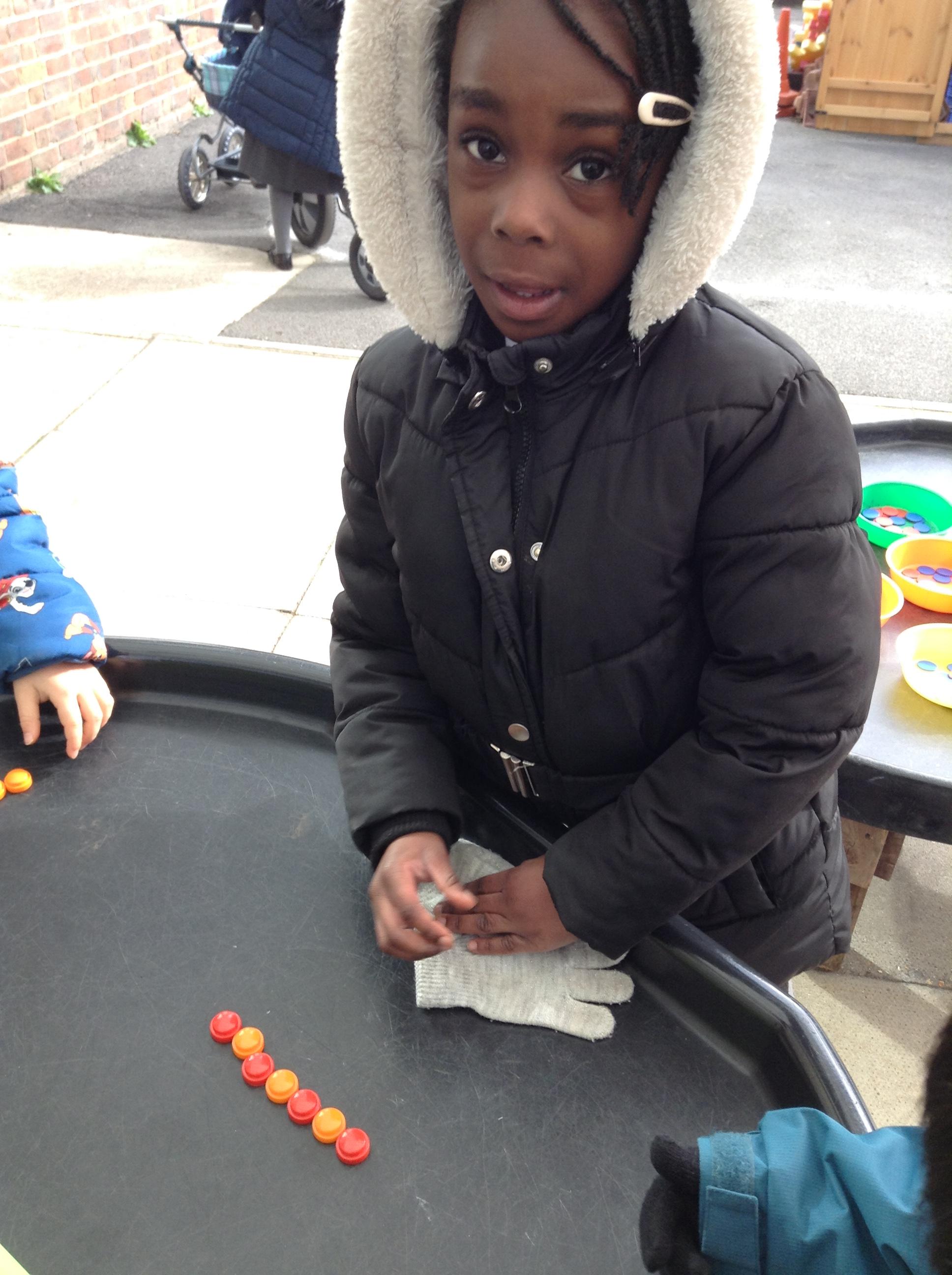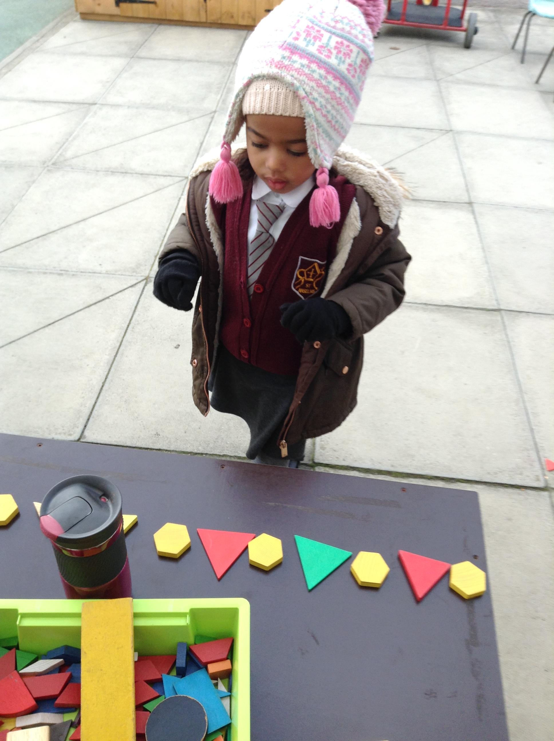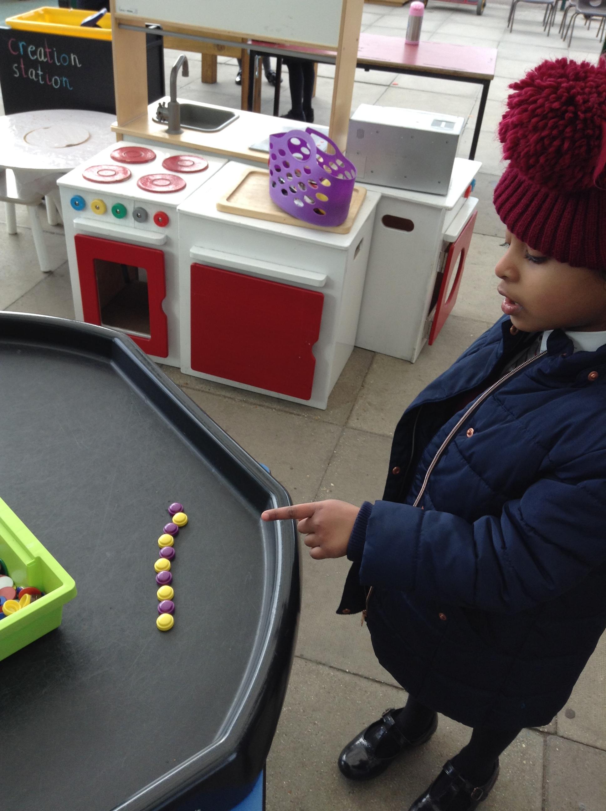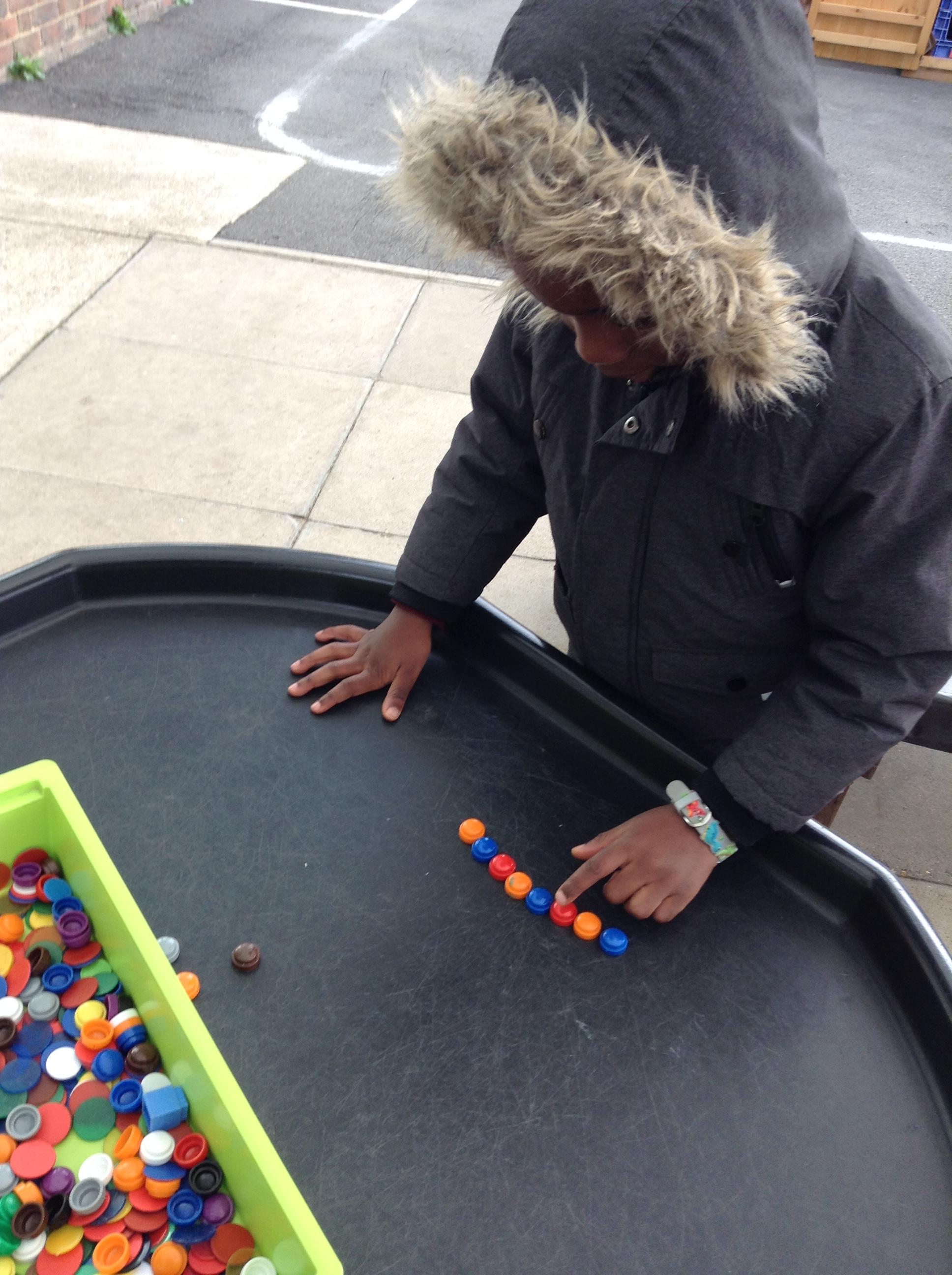 We made some great repeating patterns last week, using different coloured counters and shapes.