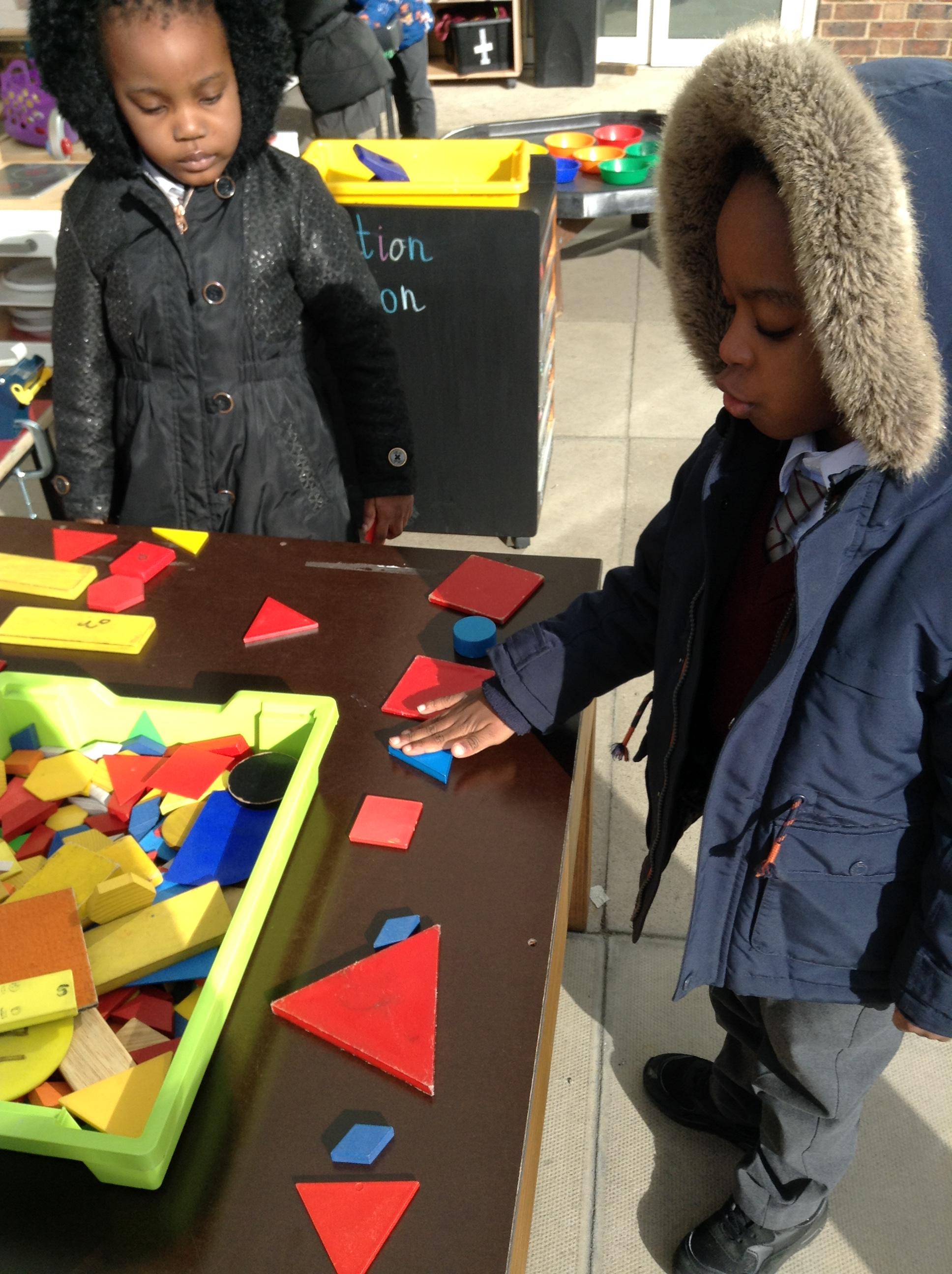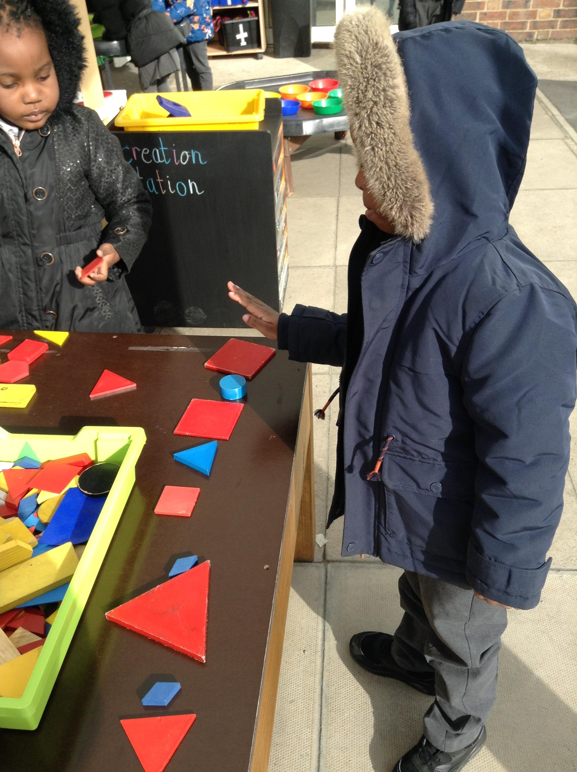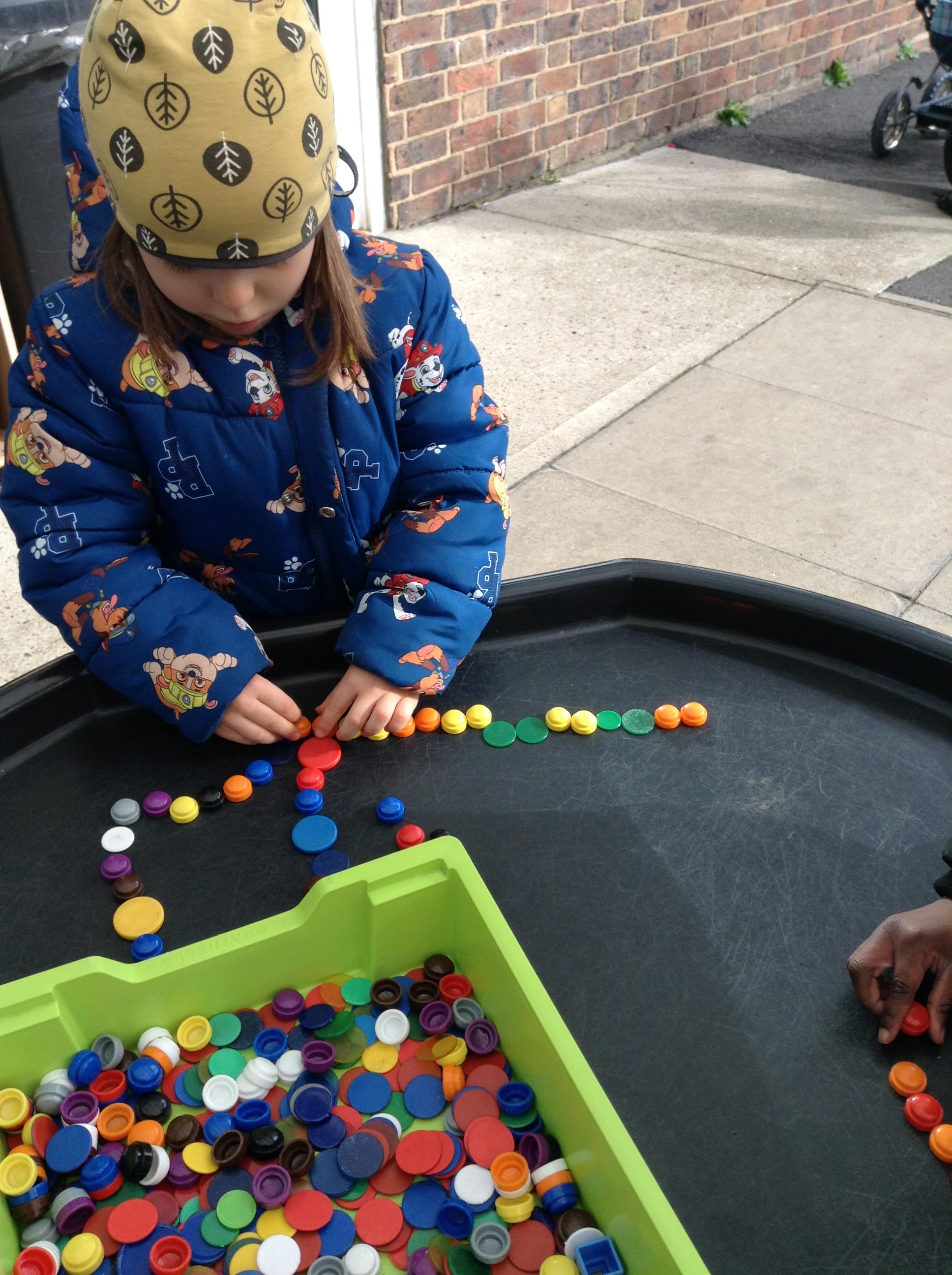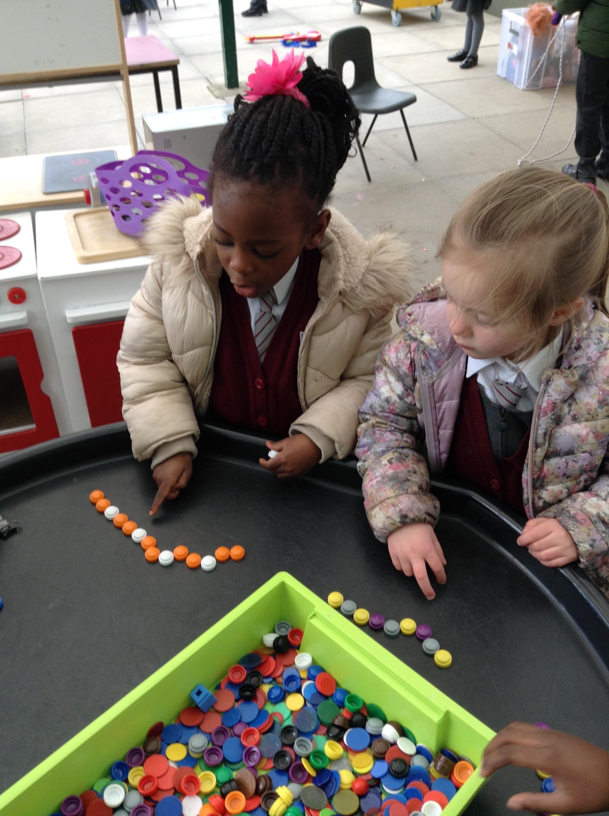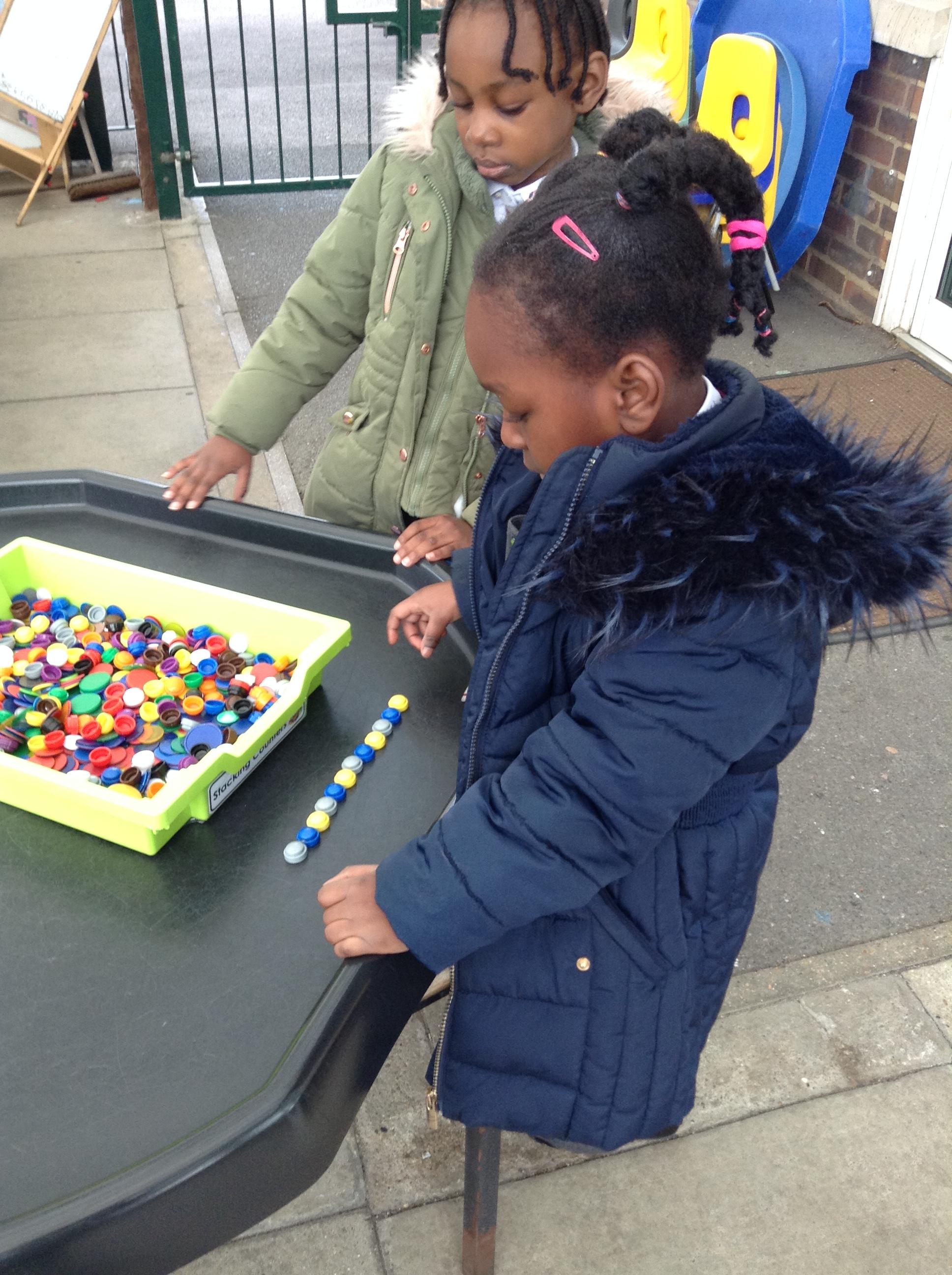 We made some great repeating patterns last week, using different coloured counters and shapes.
