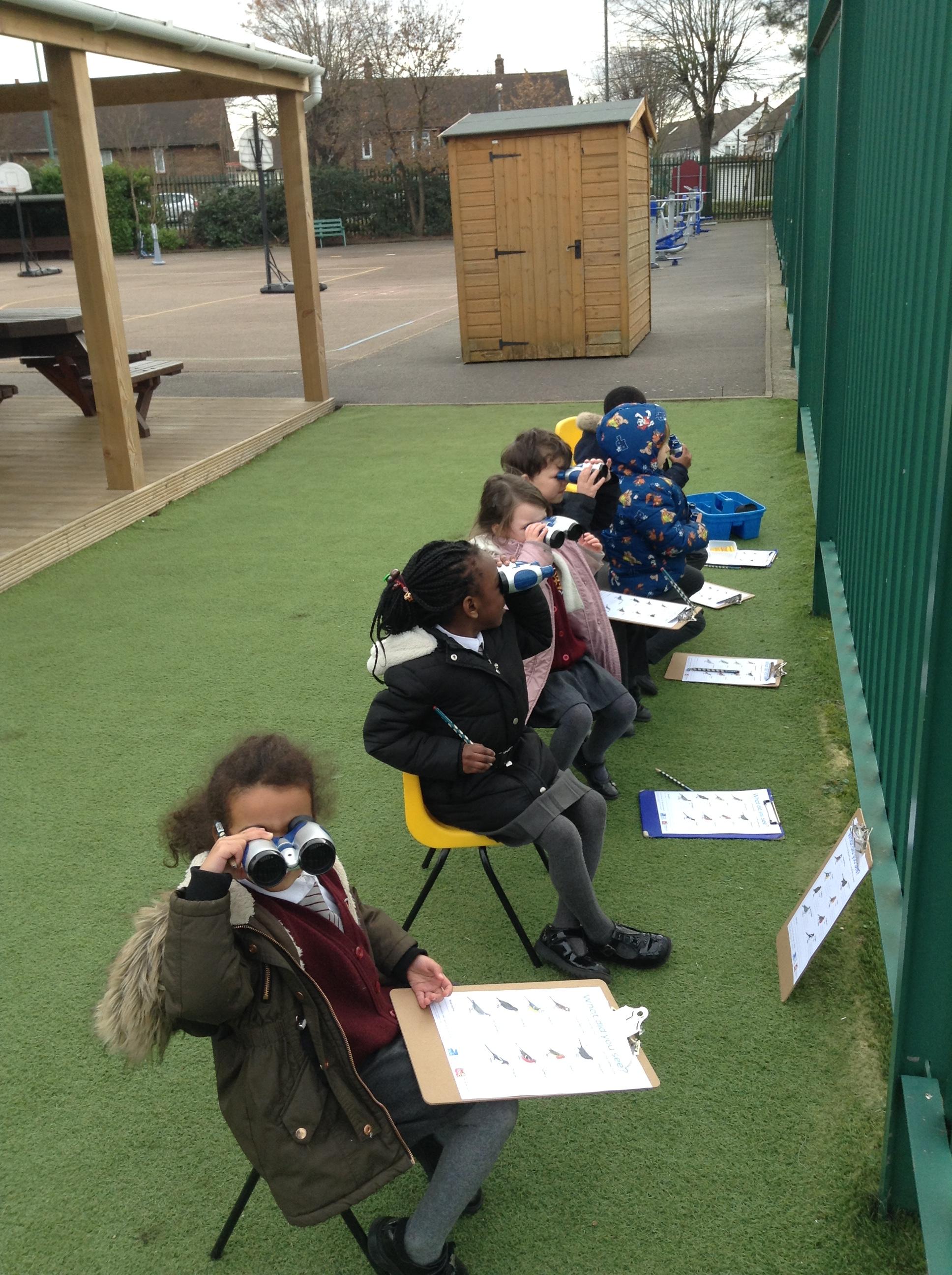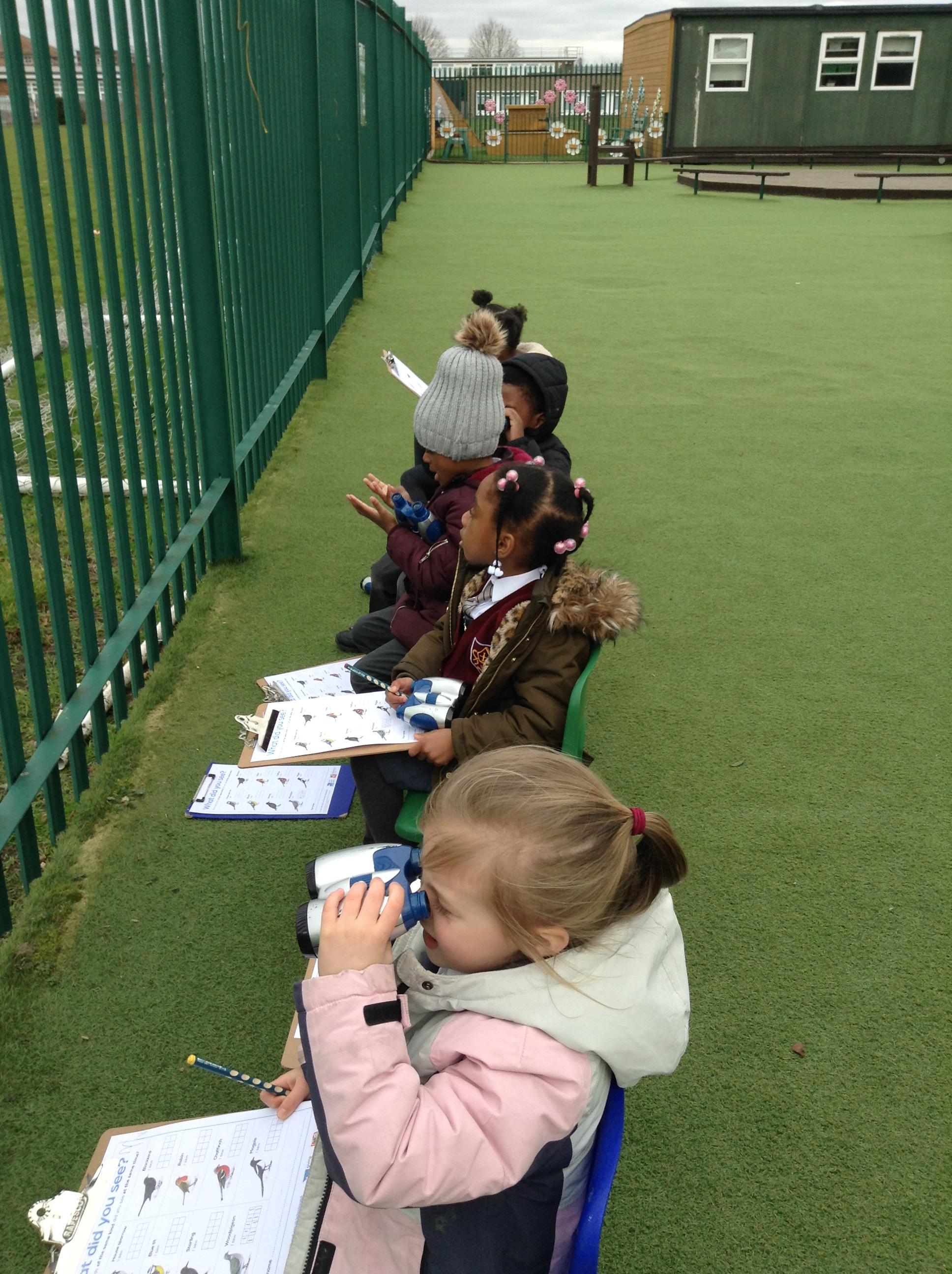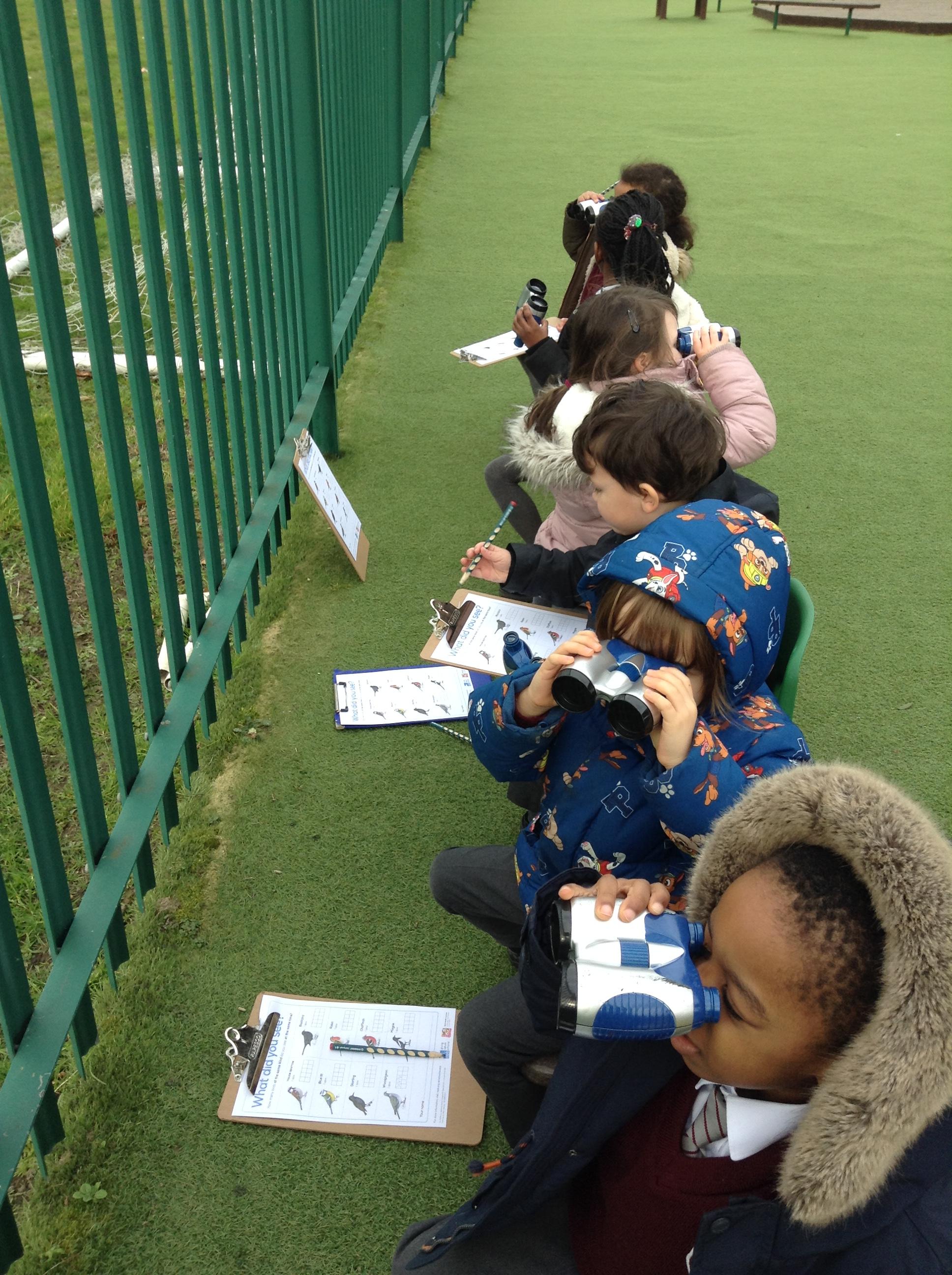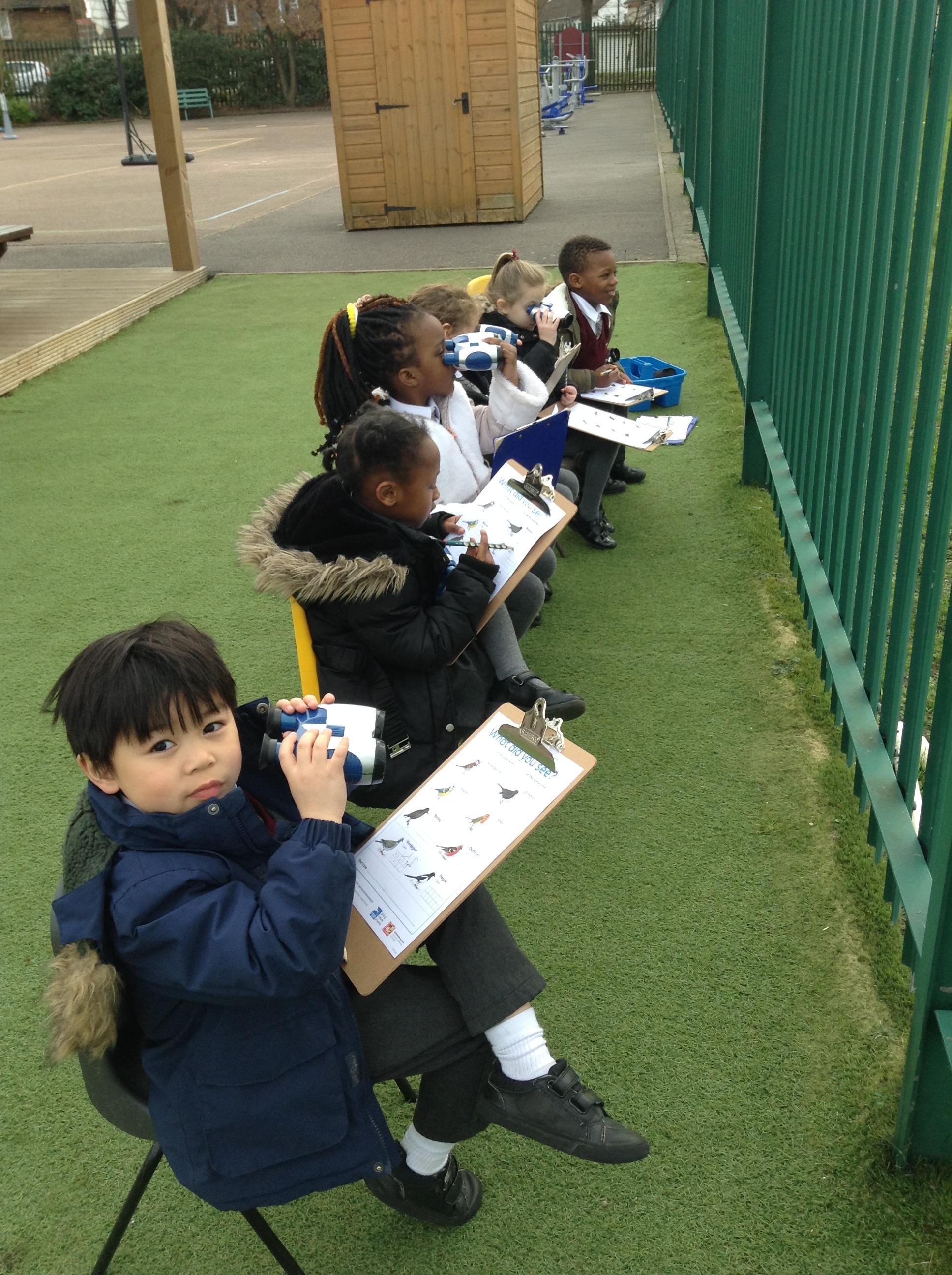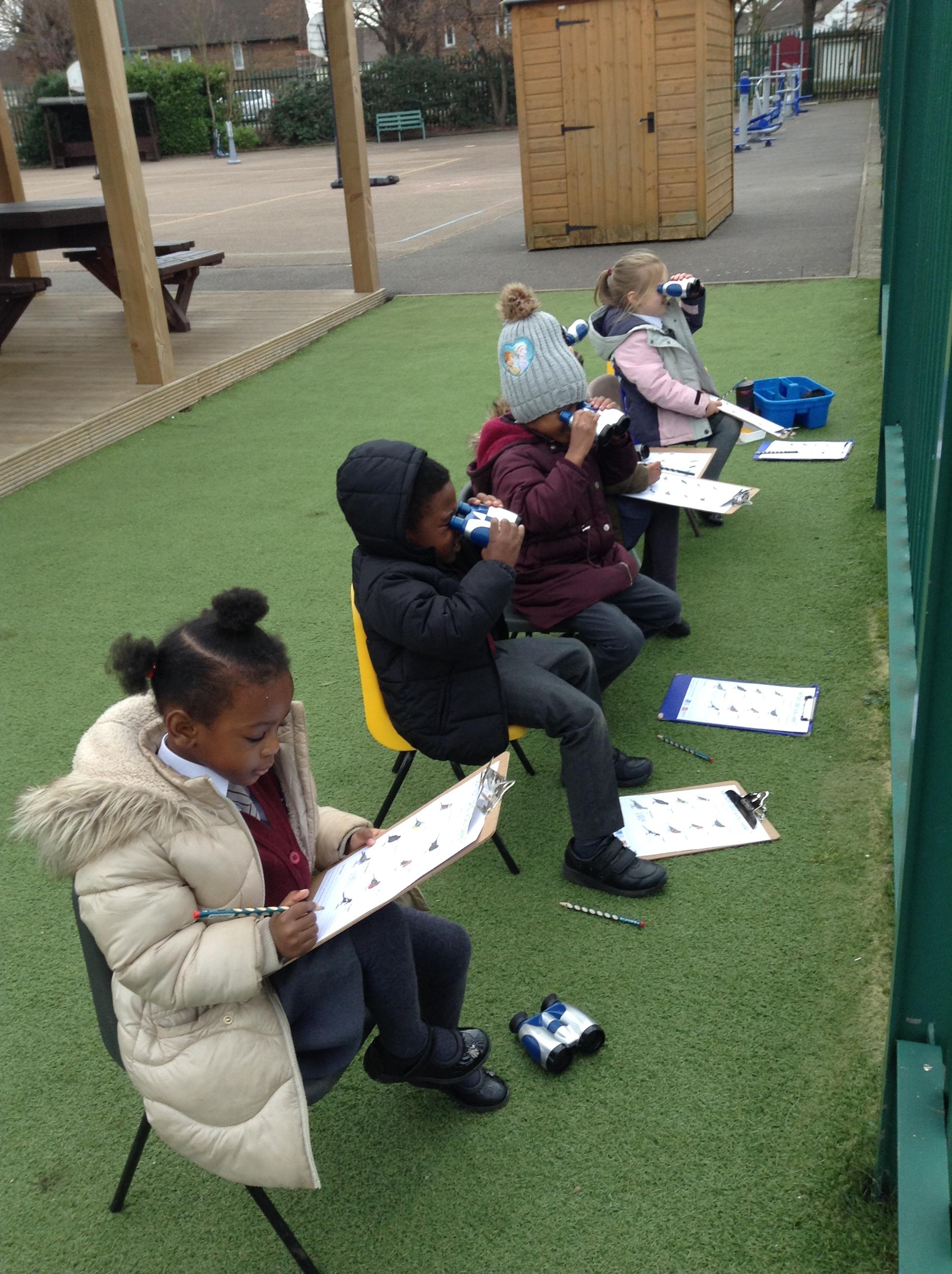 This is us taking part in the RSPB's Great School birdwatch. We looked carefully for birds out in the field and used binoculars to see if there were any in the trees. Then we had to look at the pictures to find out what type of bird it was and count how many.