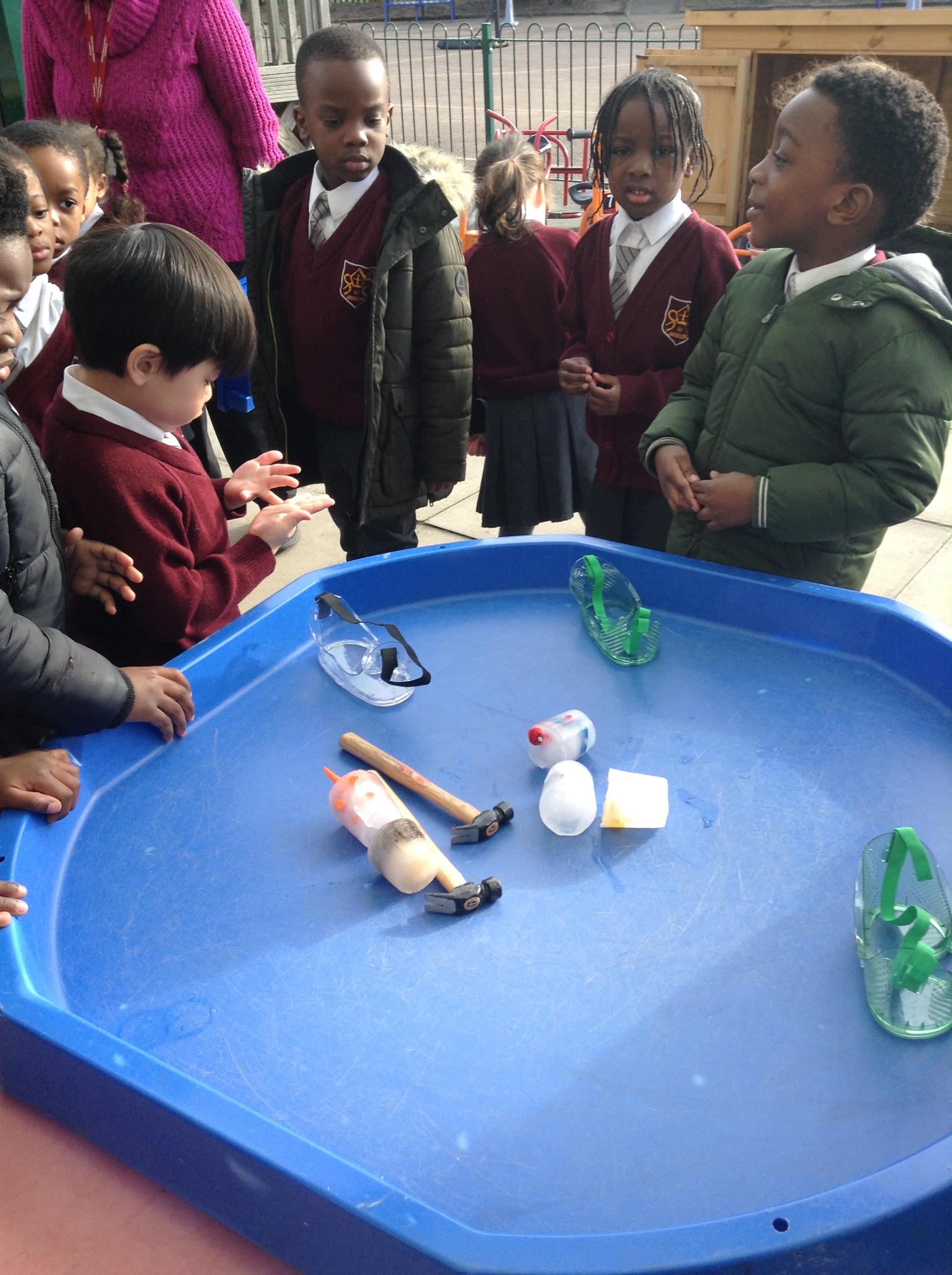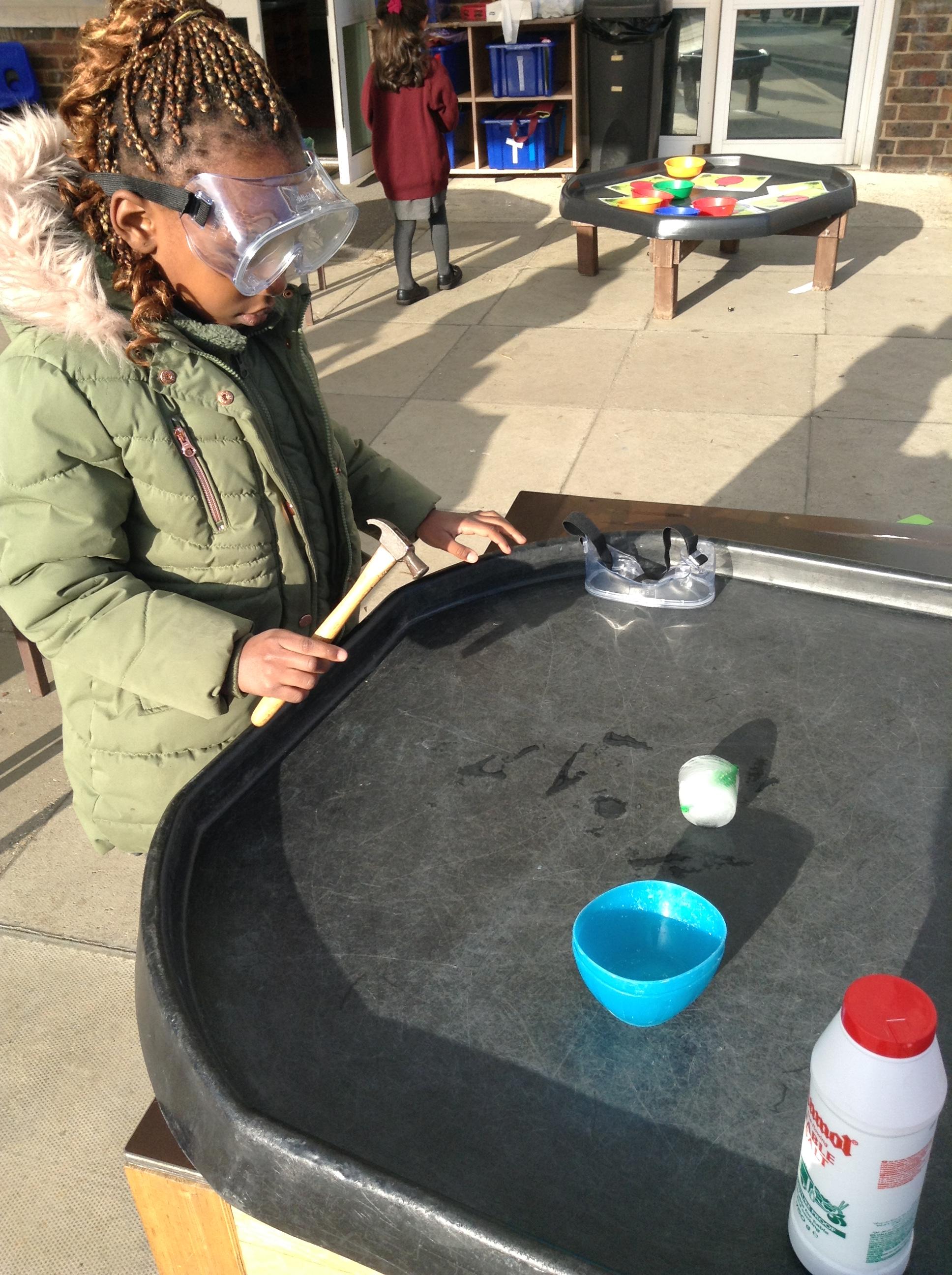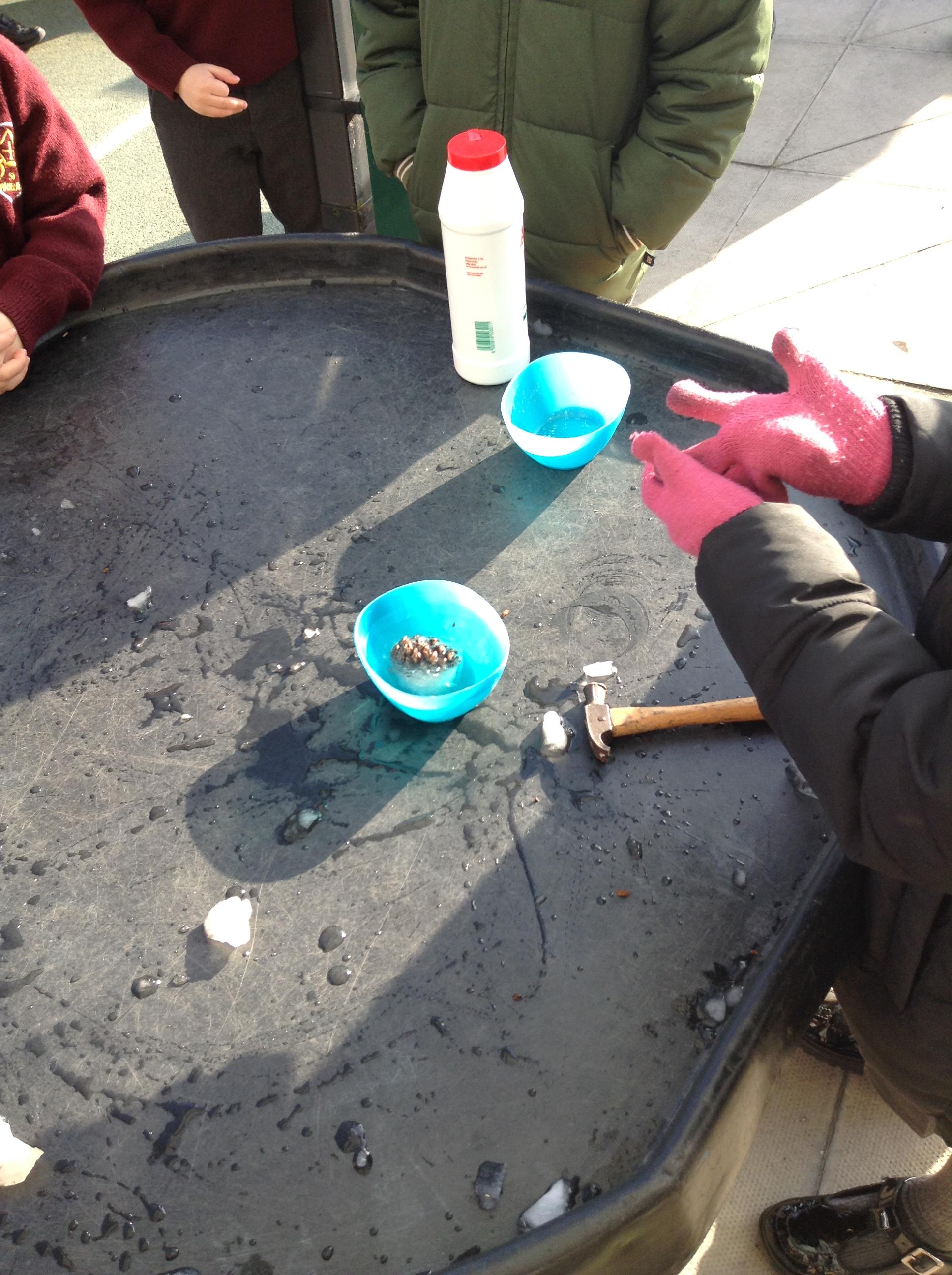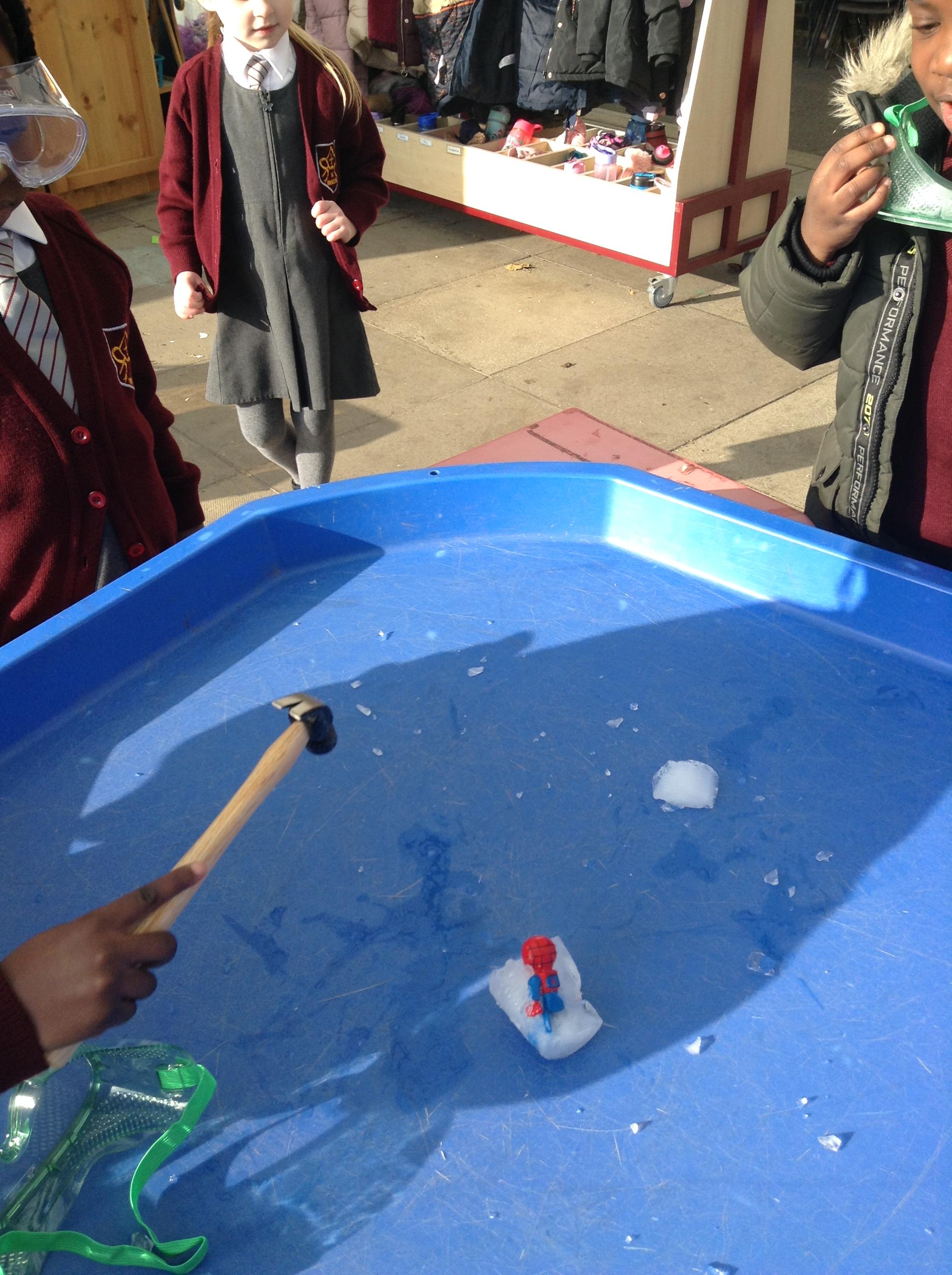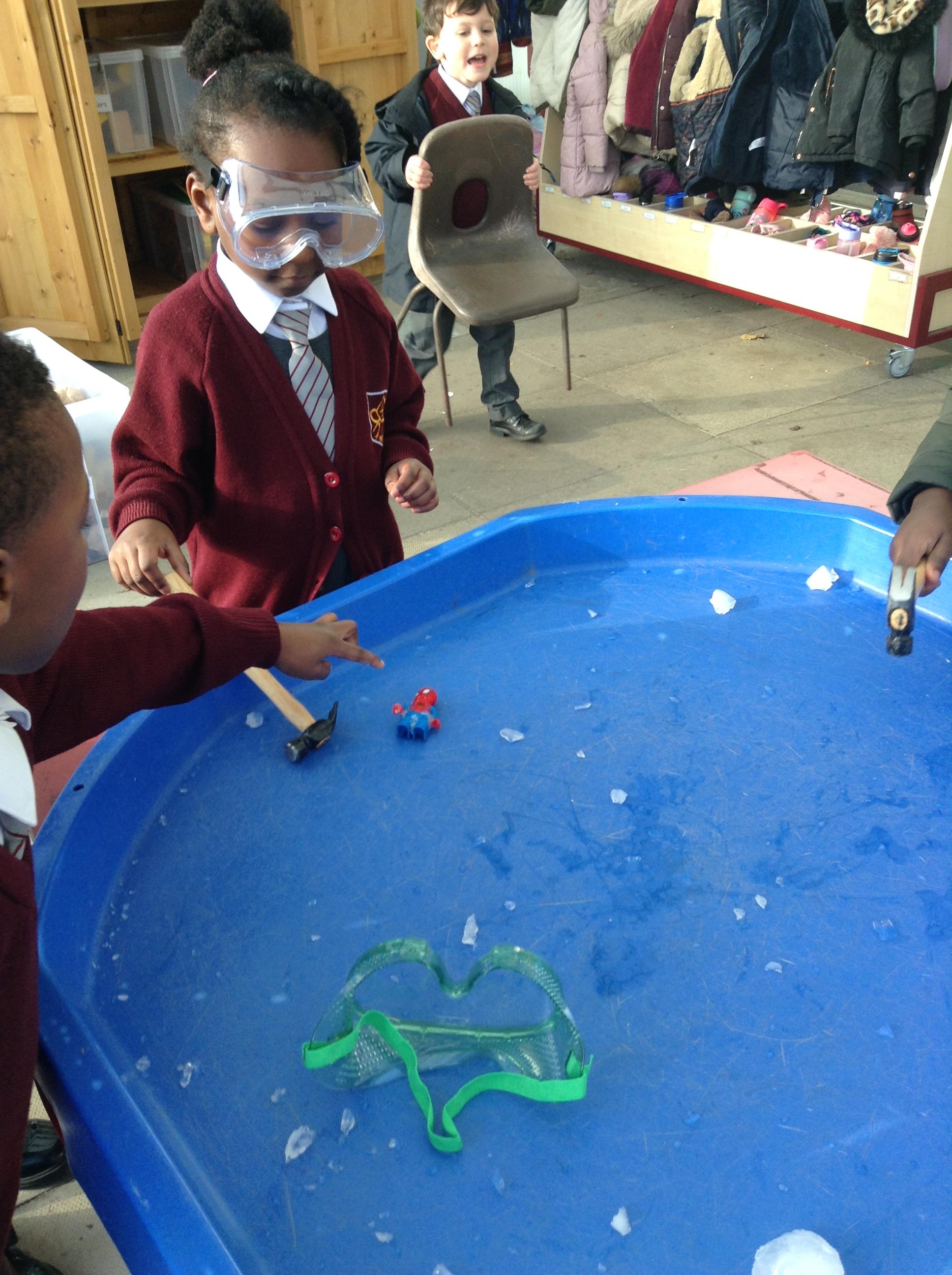 Then the Snow Queen visited our garden and turned some of the toys to ice! We rescued our toys by using hammers to break the ice. Some children used warm water and even salt to melt the ice.