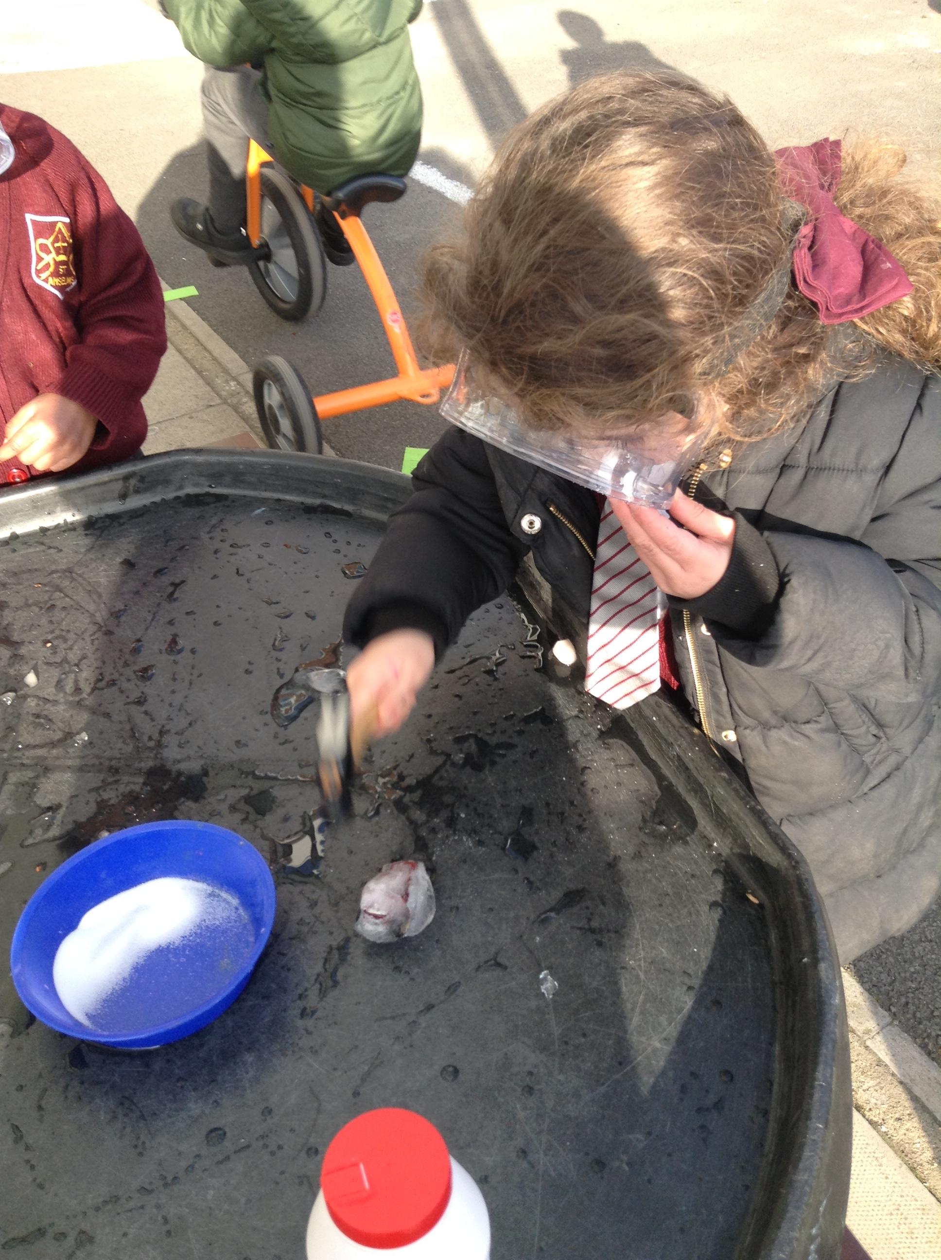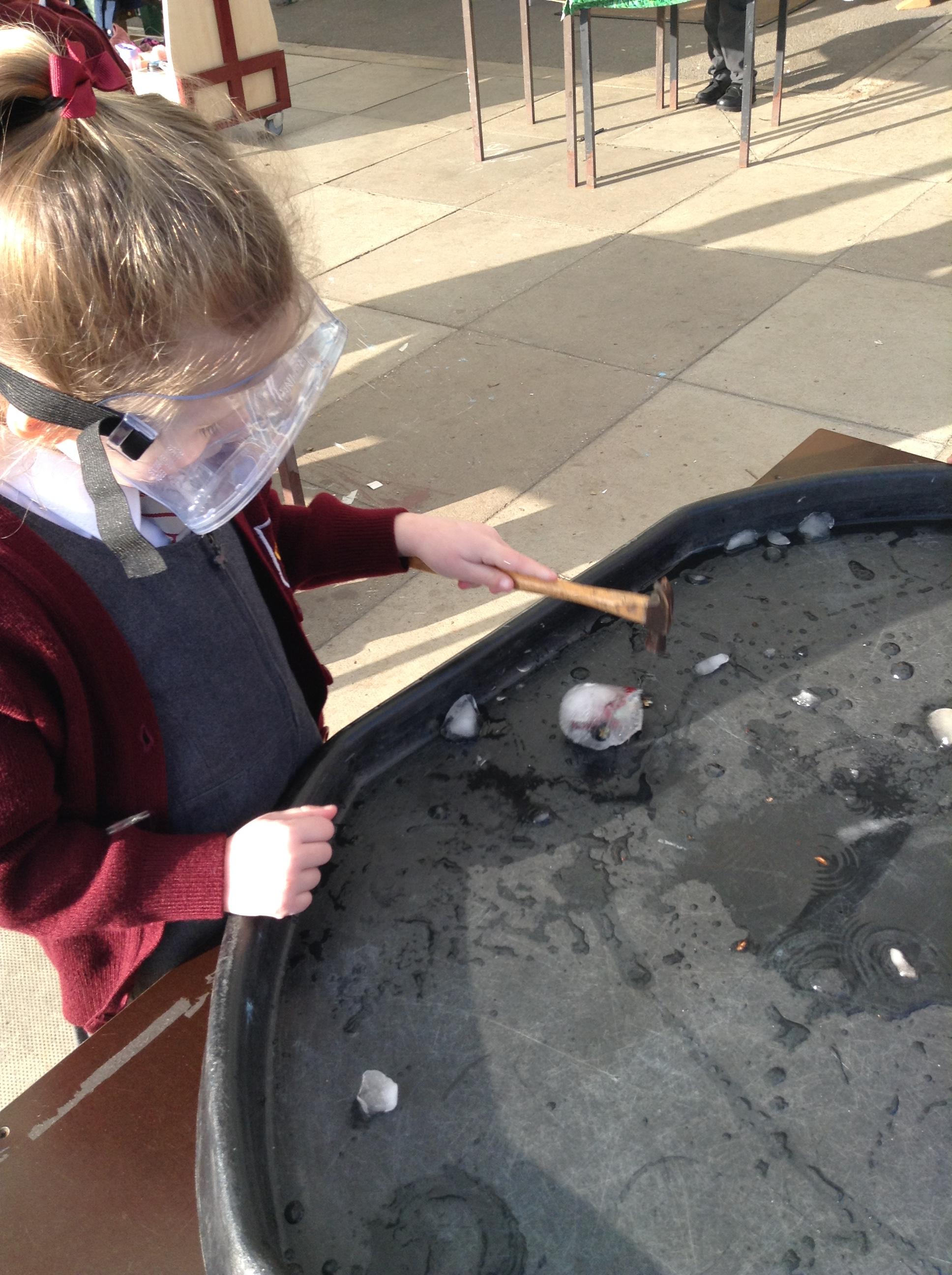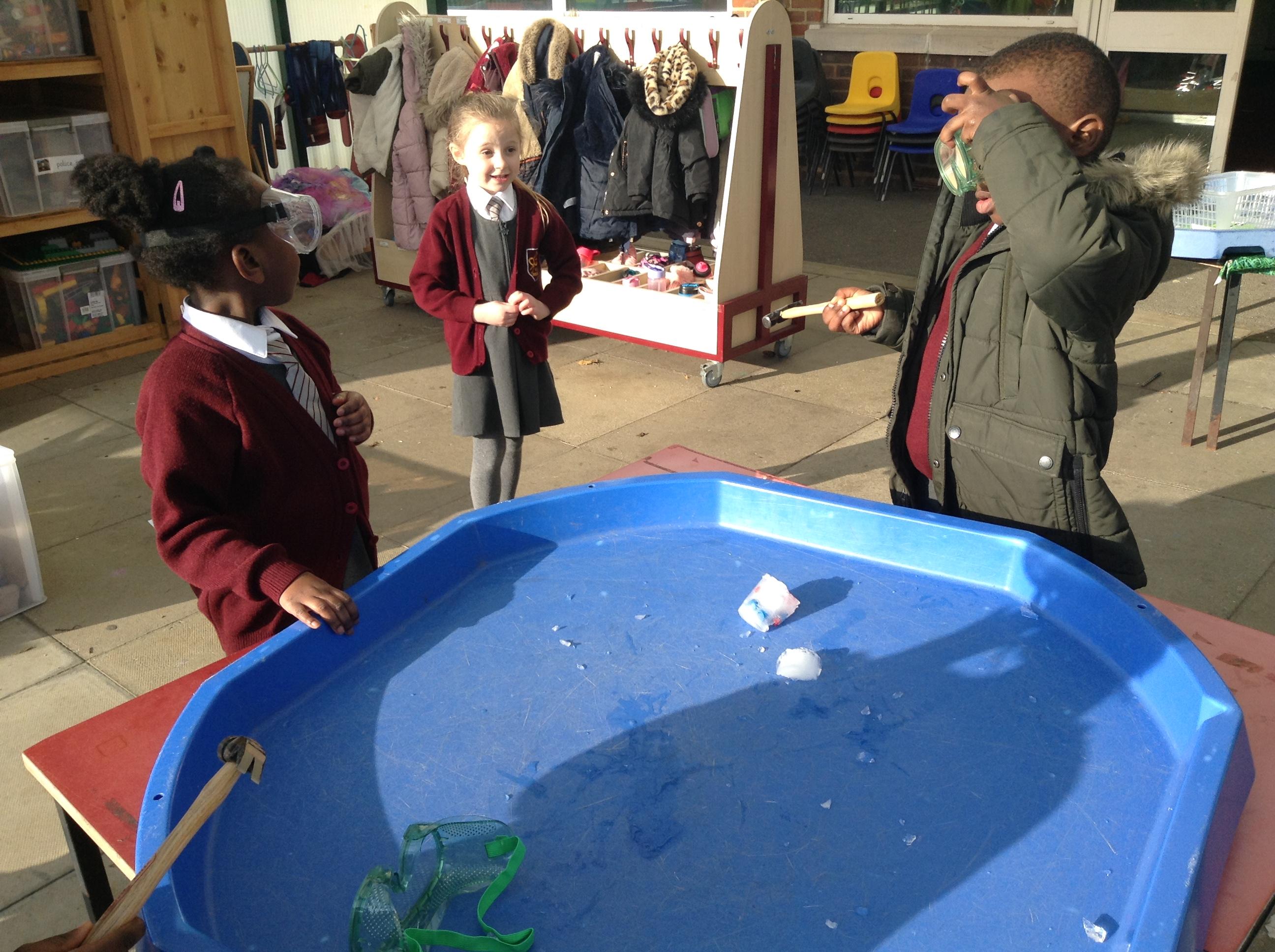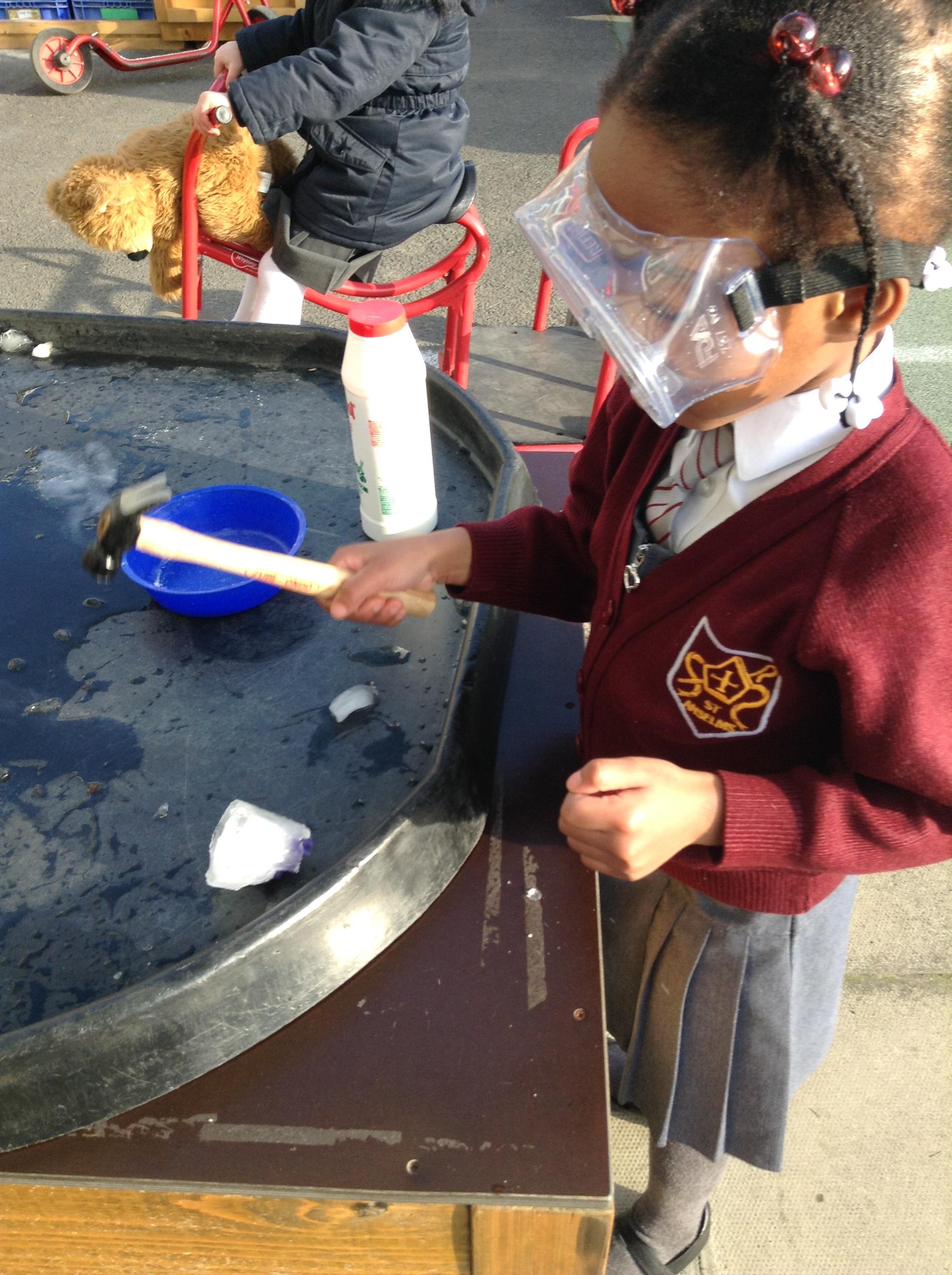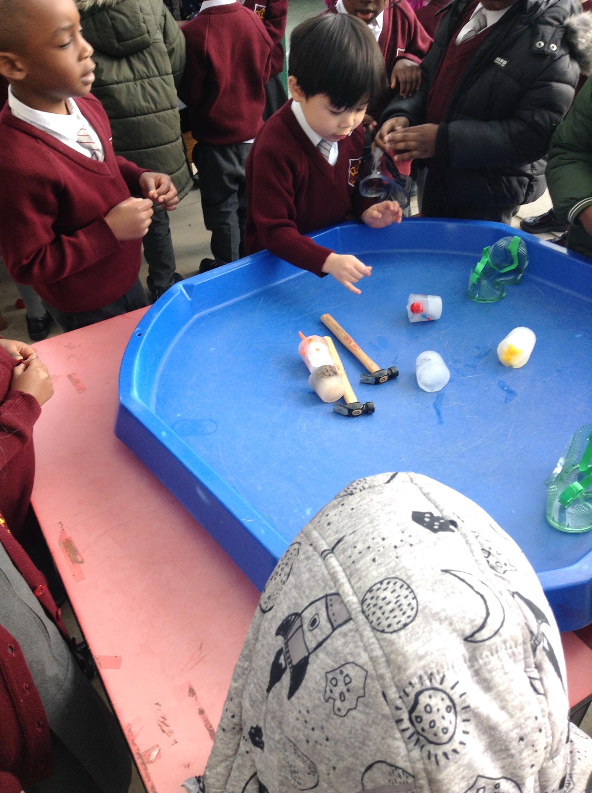 Then the Snow Queen visited our garden and turned some of the toys to ice! We rescued our toys by using hammers to break the ice. Some children used warm water and even salt to melt the ice.