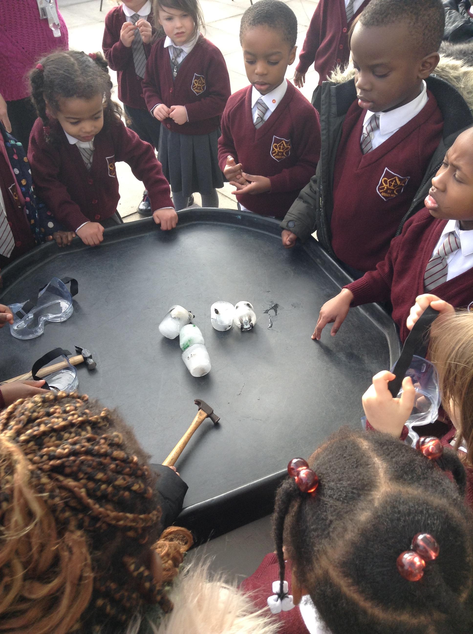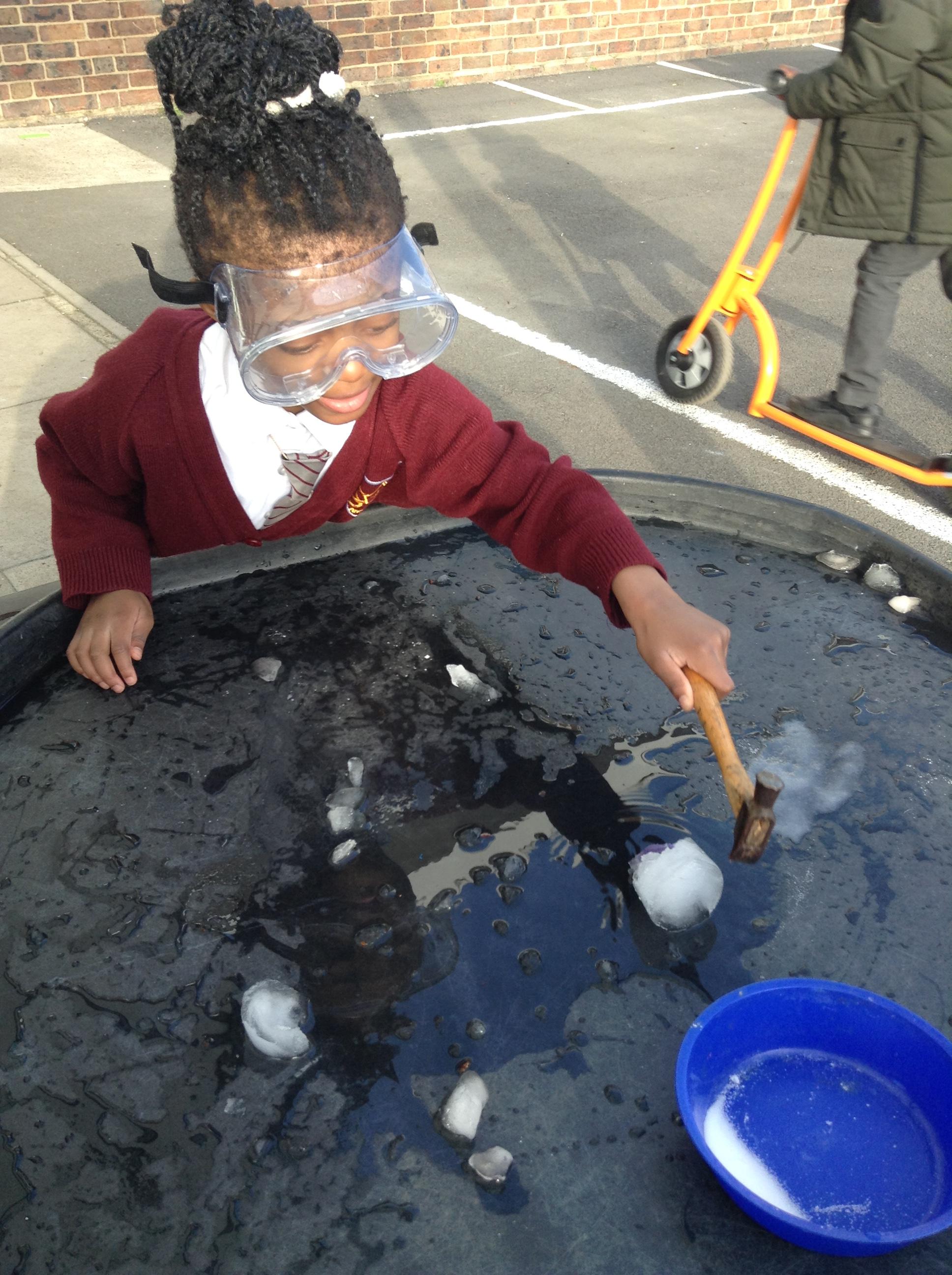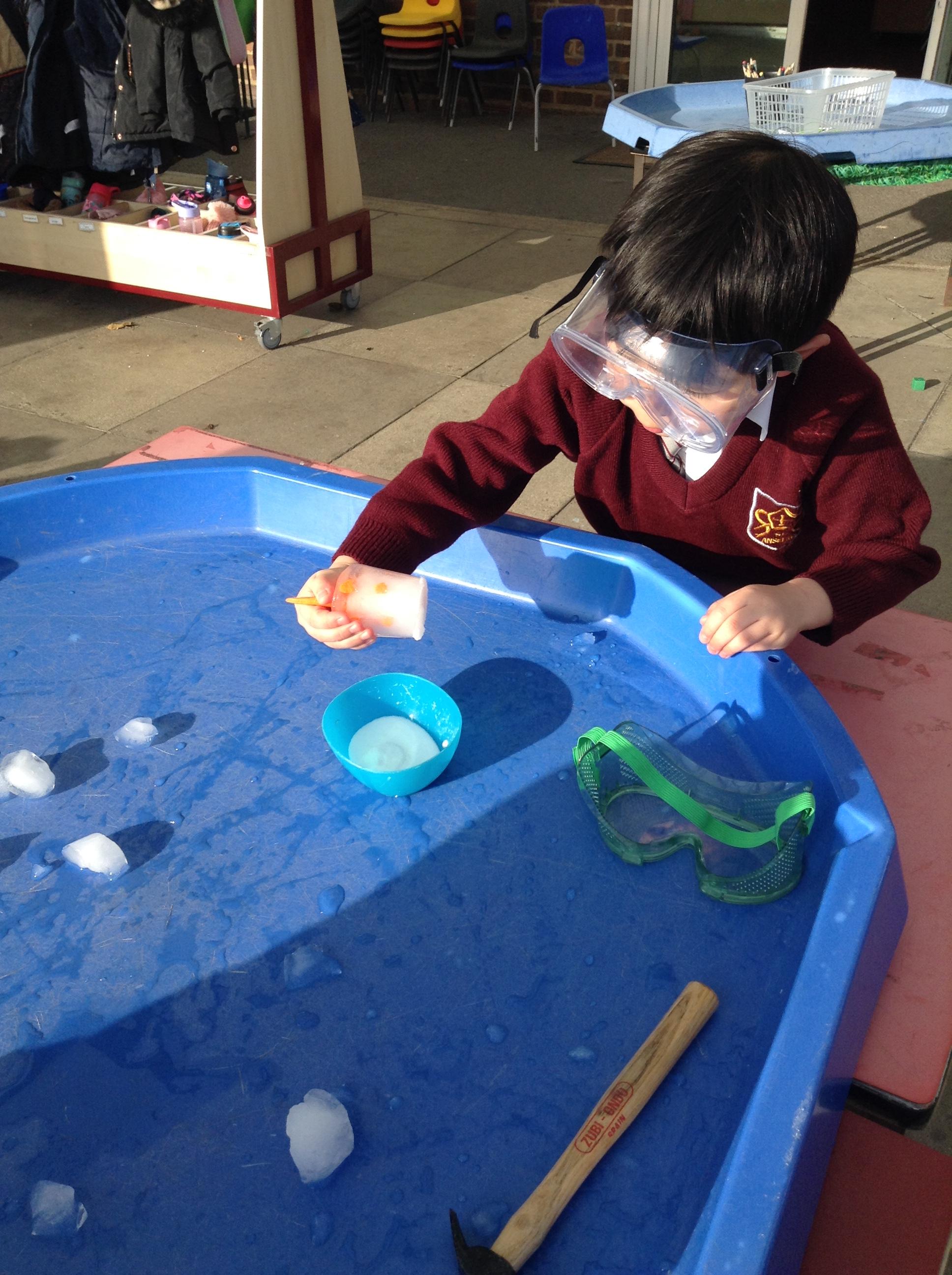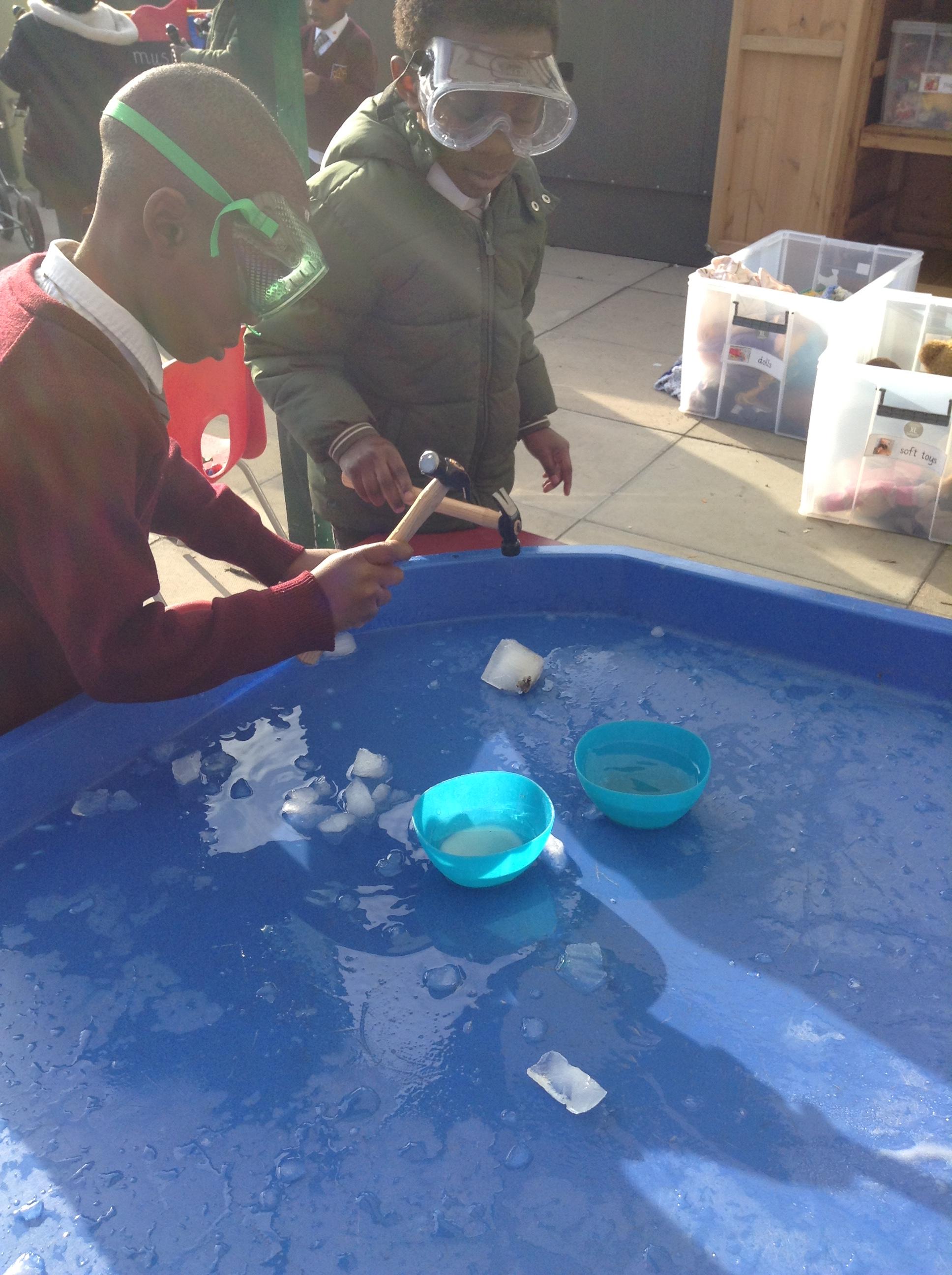 Then the Snow Queen visited our garden and turned some of the toys to ice! We rescued our toys by using hammers to break the ice. Some children used warm water and even salt to melt the ice.