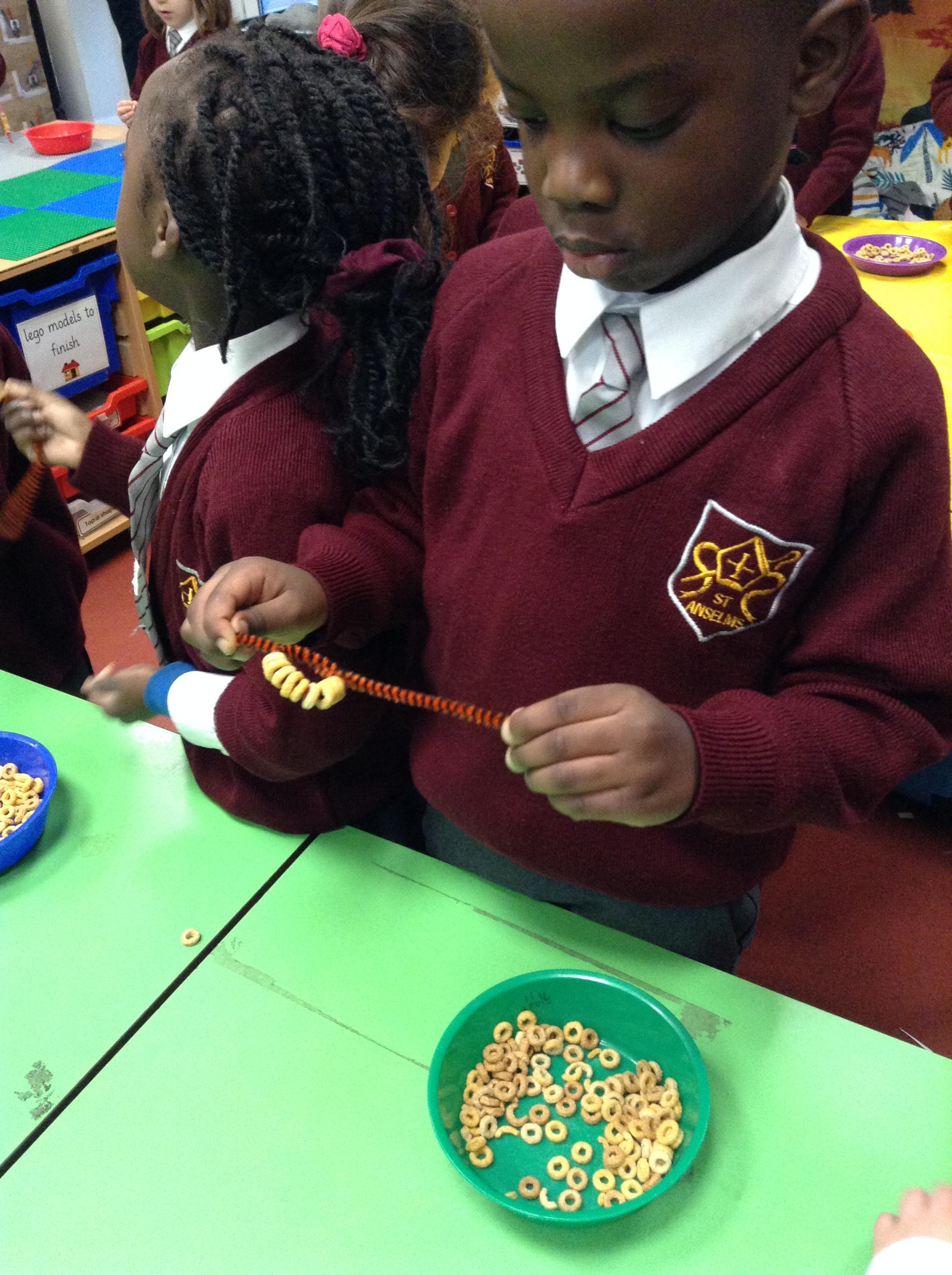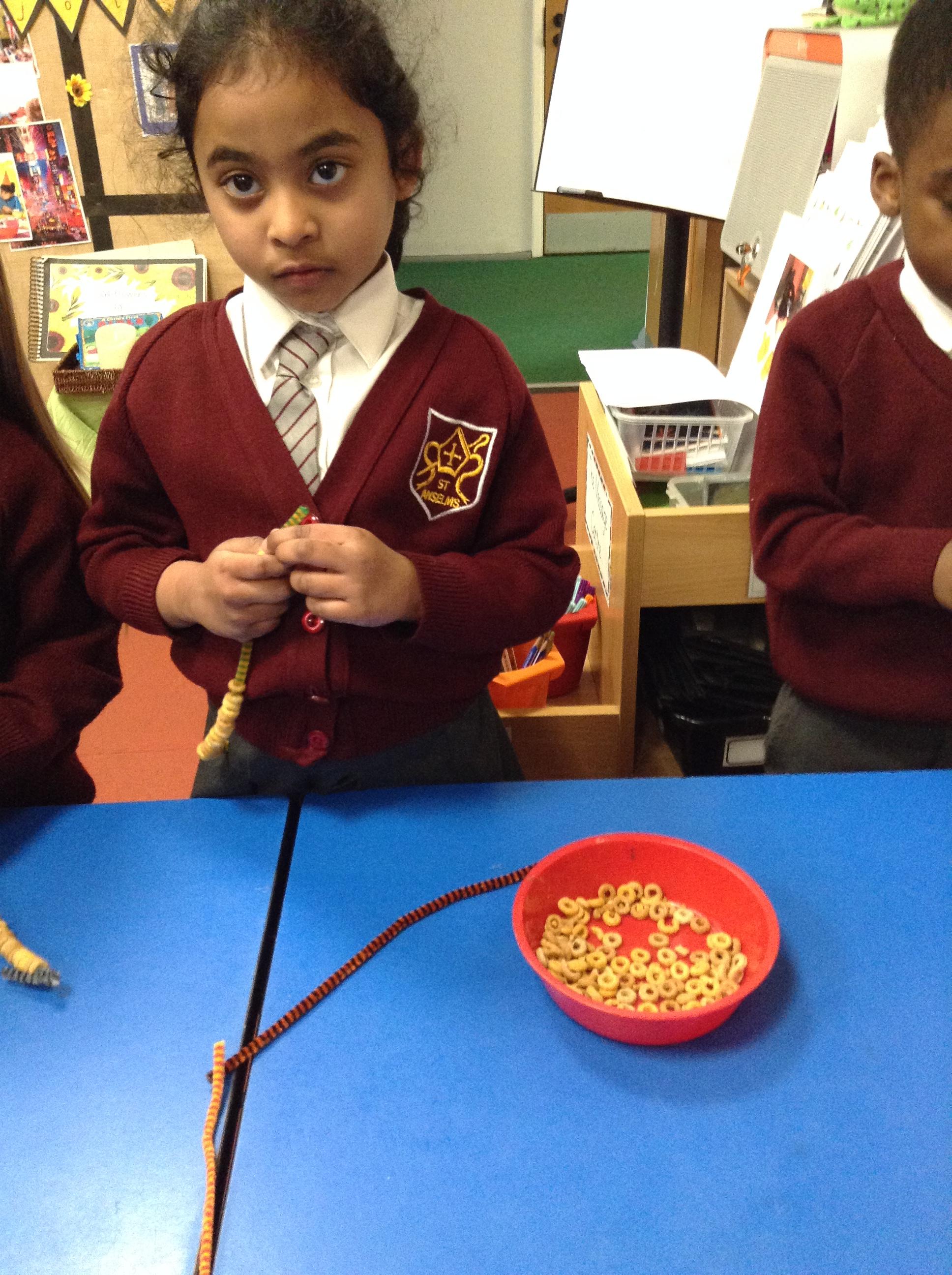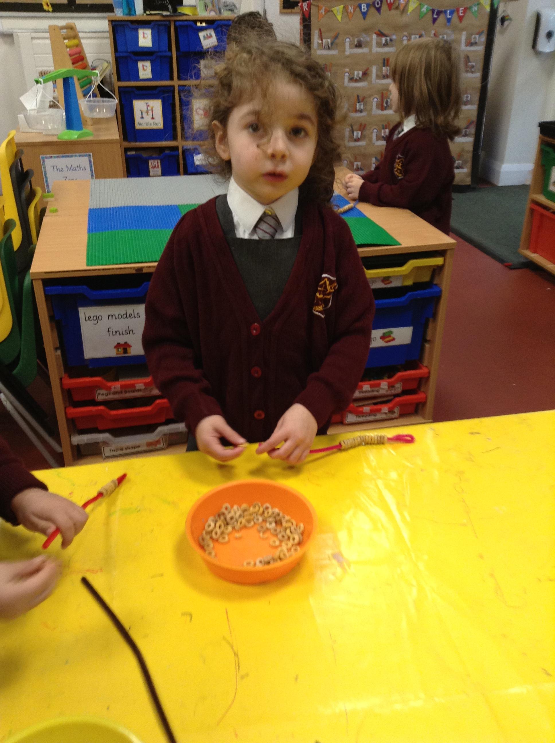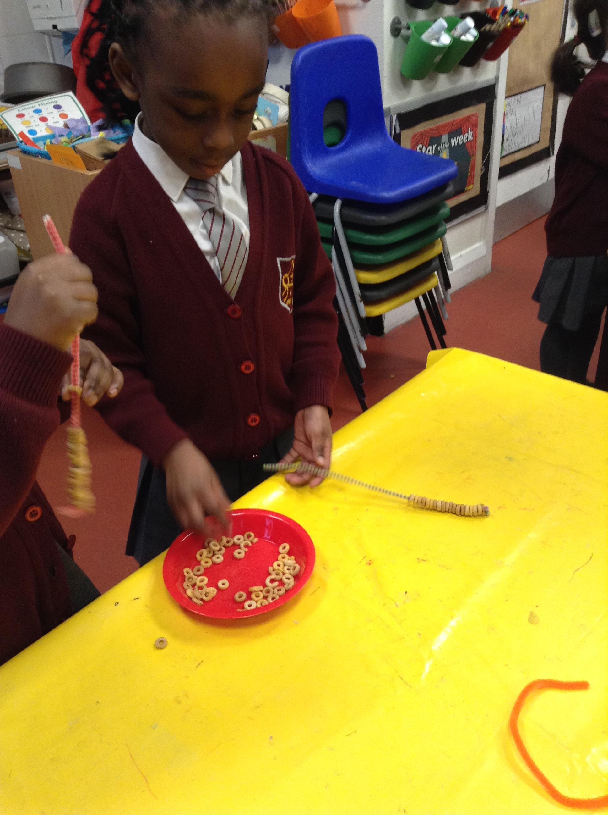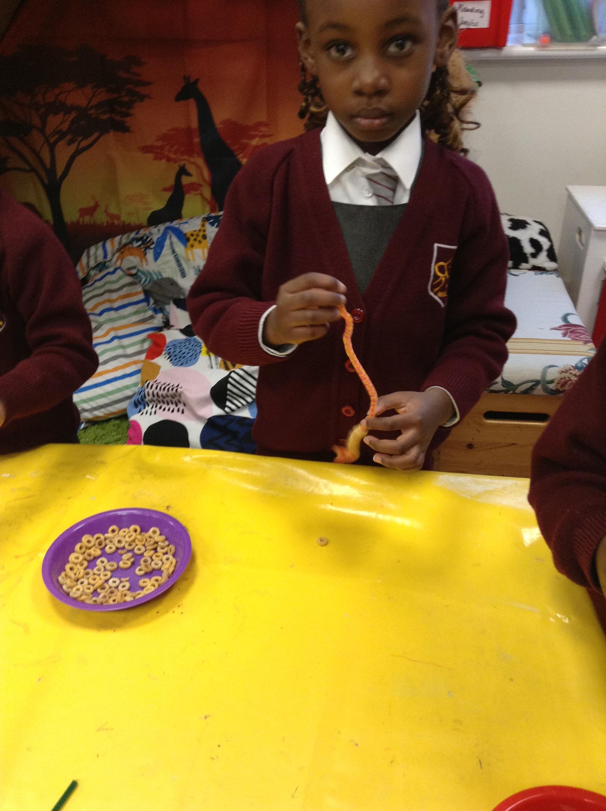 We made our own snow monsters after reading the story 'Betty and the Yeti'. We used junk modelling and thought carefully about what features we needed to include. After reading 'One Snowy Night' we thought about how hungry the poor birds might be in the winter and used cereal hoops threaded on to pipe cleaners to make bird feeders. We stayed very quiet and watched to see if any birds used the bird feeders.