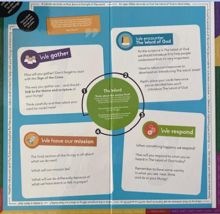 They then set about choosing appropriate activities for each of the four sections of the liturgy - gather; prepare for the word; response to the word; and mission.